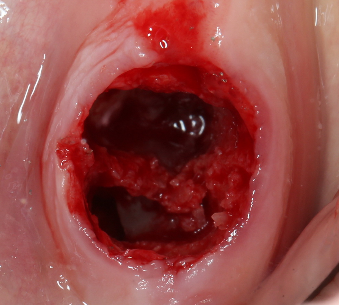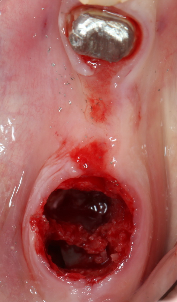 С одной стороны, немедленная имплантация могла бы решить эти проблемы: нагрузка восстанавливается довольно быстро, а репаративные процессы в лунке зуба способствуют интеграции импланта. Но, с другой стороны, иногда бывают ситуации, когда немедленная имплантация была бы, если и не невозможной, то очень рискованной операцией. Напомню, что одним из противопоказаний к немедленной имплантации является недостаточный объем костной ткани для первичной стабилизации импланта — и это основное показание к консервации лунки. А это бывает, к примеру, при наличии больших по размеру гранулем и кист в области удаляемых зубов, либо при близком расположении корней верхних зубов к альвеолярной бухте гайморовой пазухи.