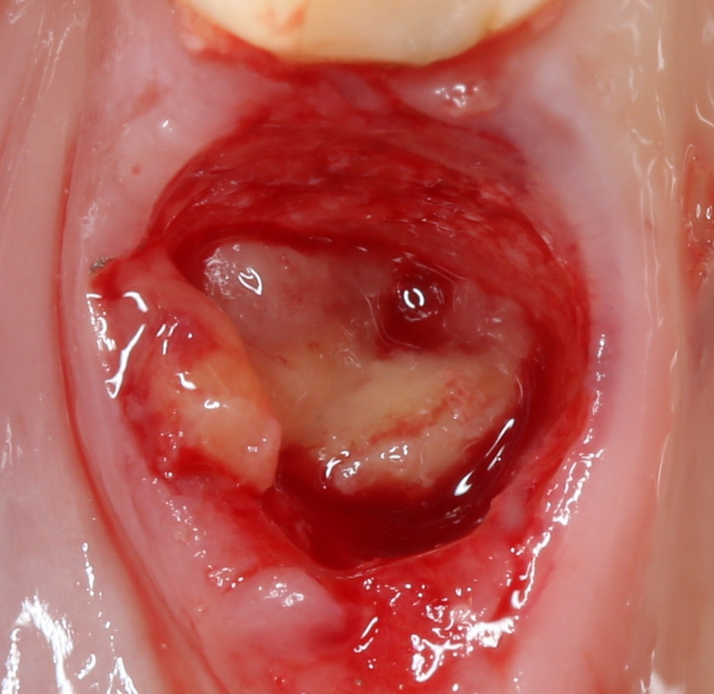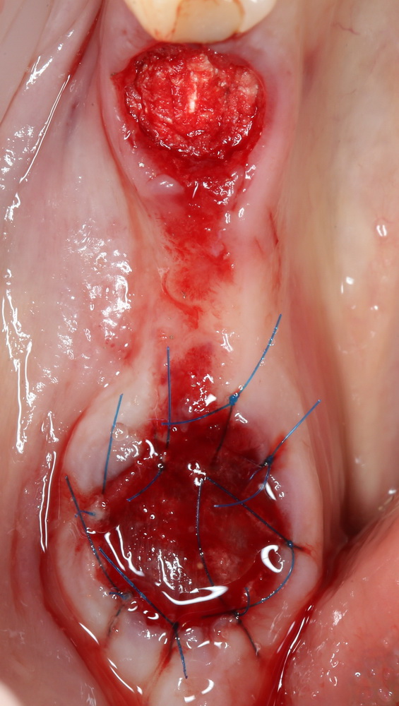 Очень аккуратно удалили зуб. Убрали из лунки все грануляции. В область верхушки корня зуба — Neocones, остальная часть альвеолы — Bioss Collagen. Сама лунка запечатывается Mucograft Seal: