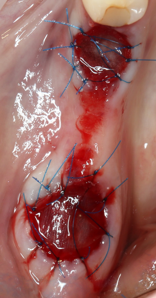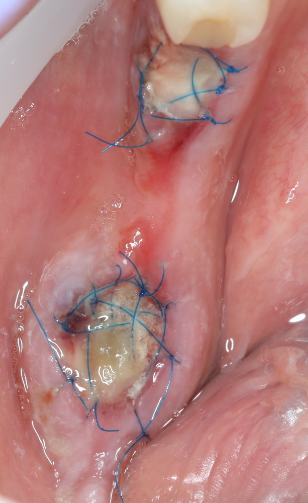 НЕЛЬЗЯ оставлять биоматериал открытым, не защитив его коллагеновой матрицей (Mucograft Seal, etc) или слизистотканным лоскутом. Он быстро инфицируется микробами из полости рта — результат лечения не просто исчезает, но и значительно ухудшается.