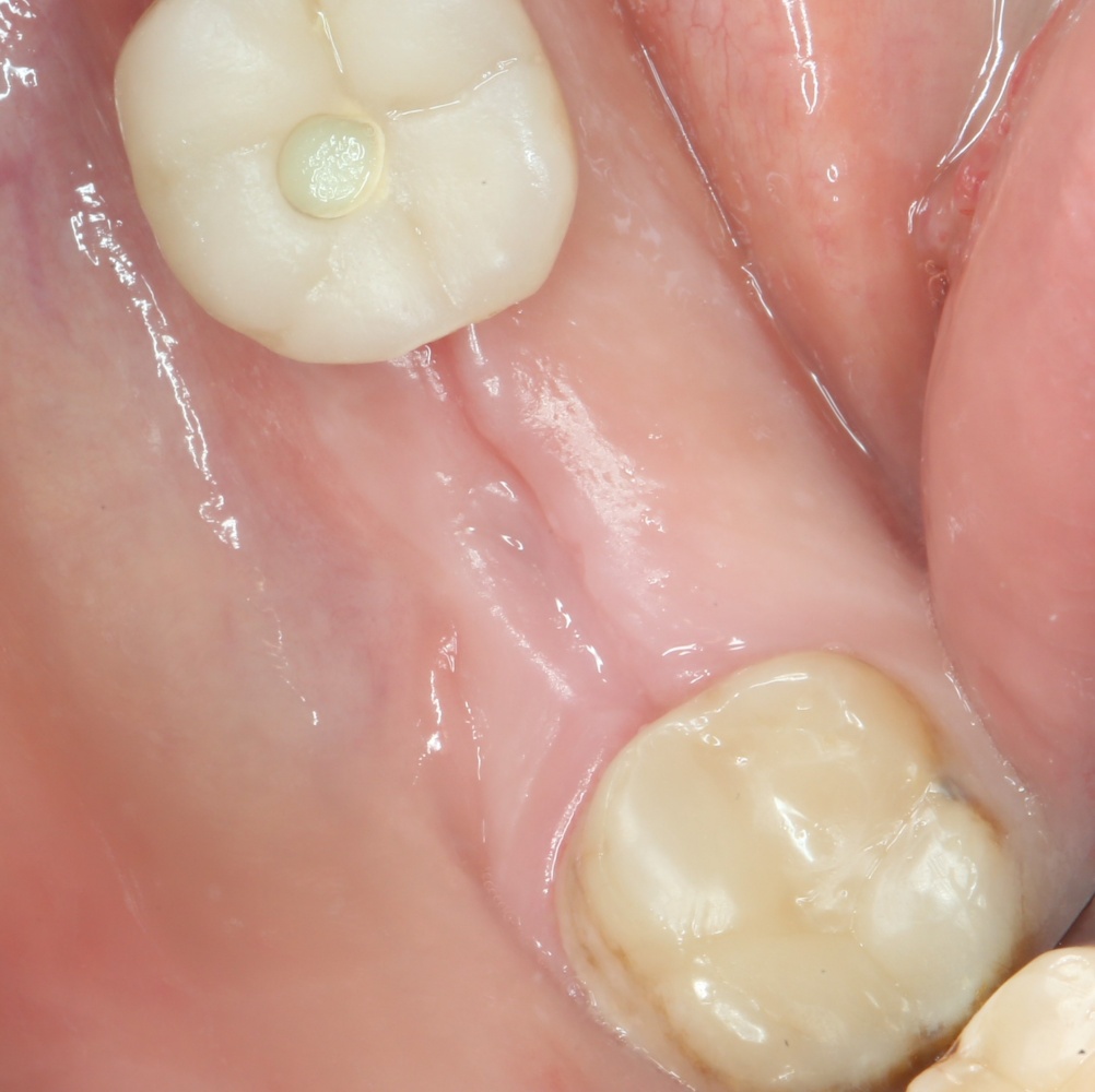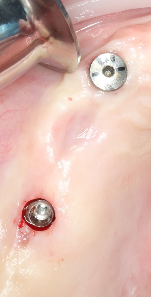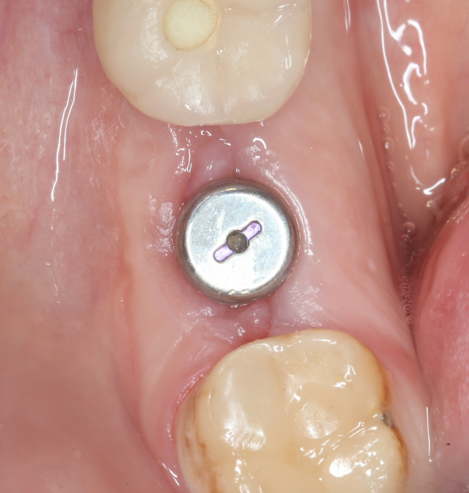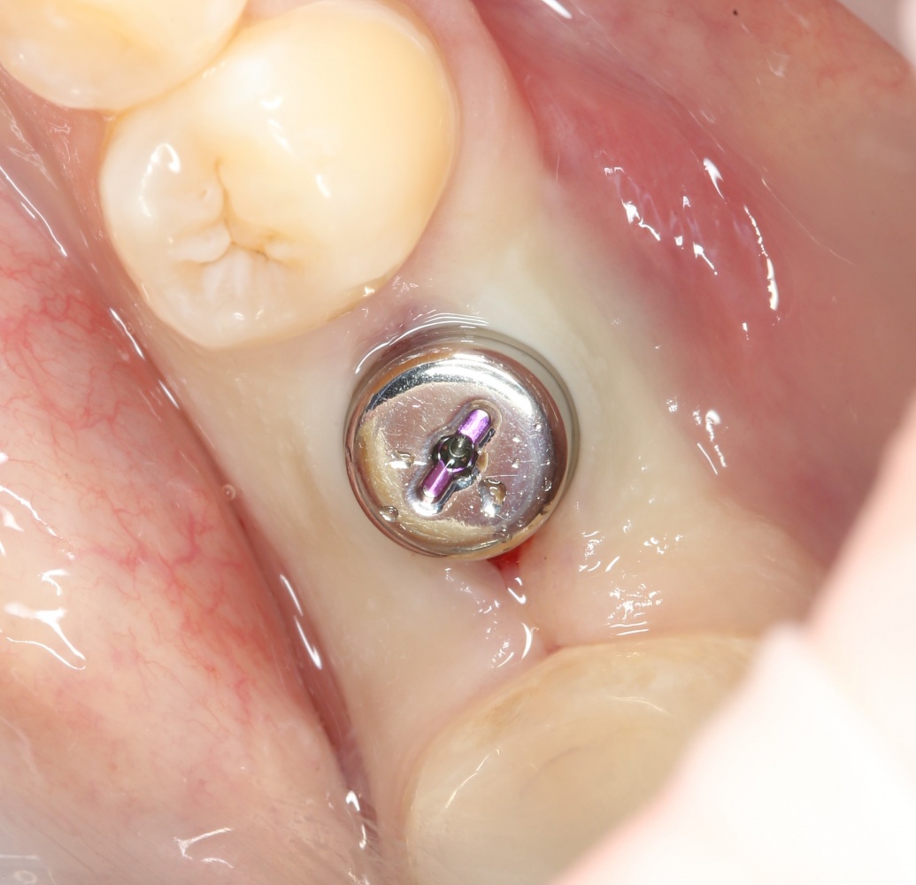 Например, в данном случае мы не смогли закончить операцию так, как планировали, поэтому подождали полтора месяца и поставили имплантат отсроченно:
