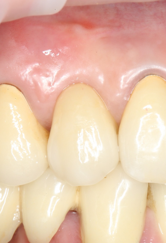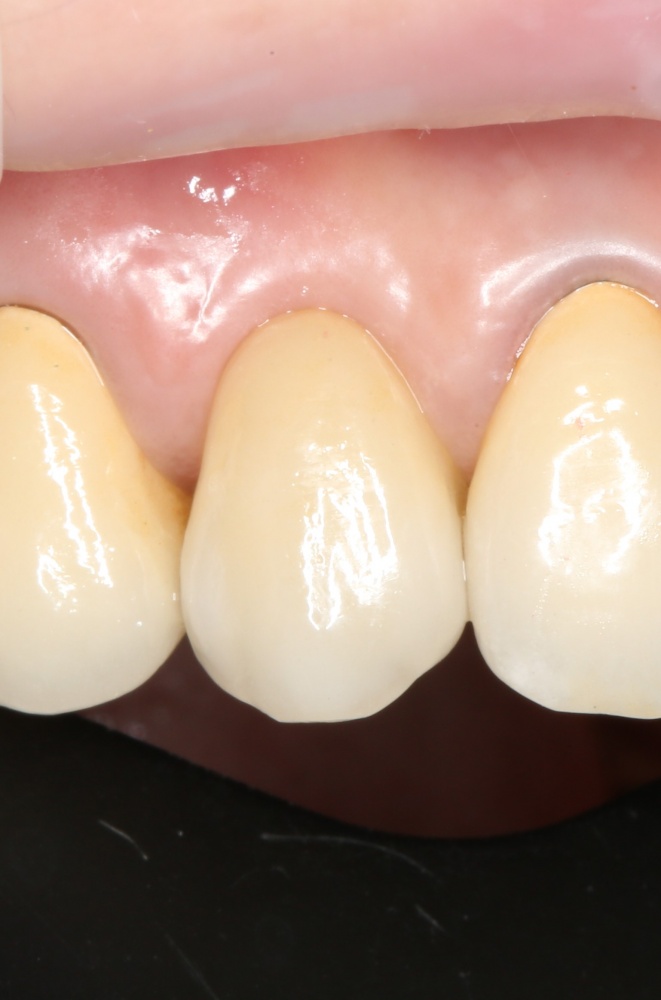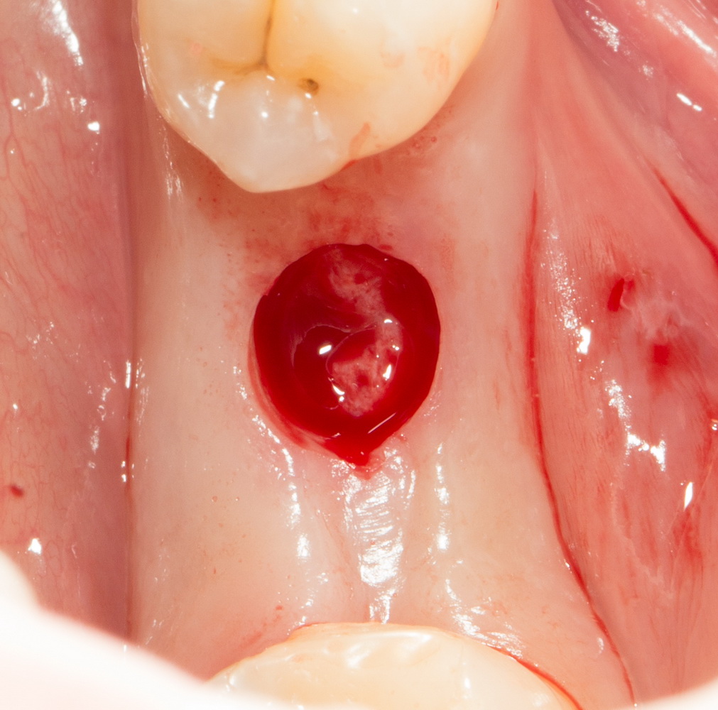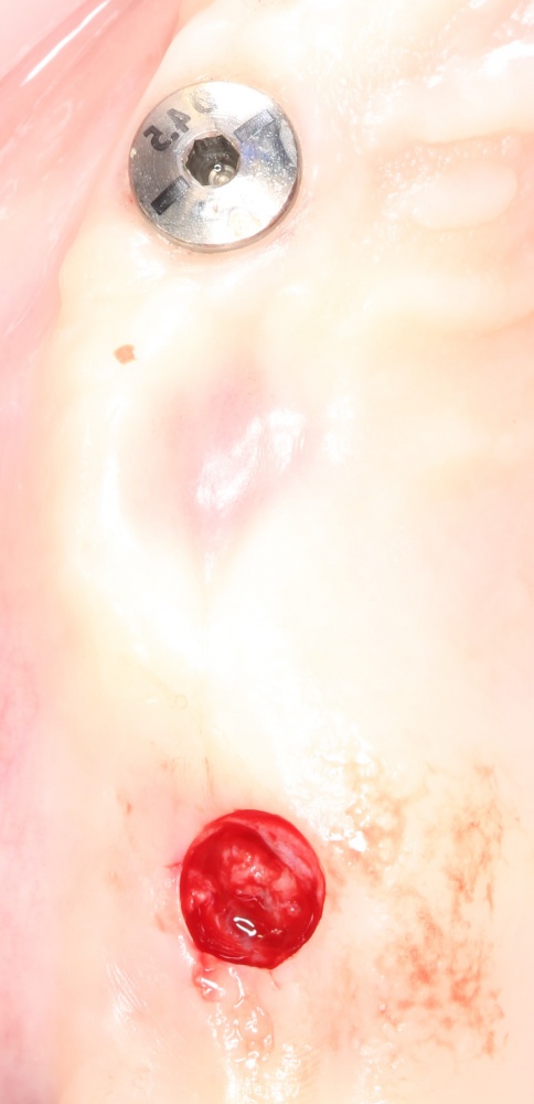 Например, в данном случае мы не смогли закончить операцию так, как планировали, поэтому подождали полтора месяца и поставили имплантат отсроченно:
