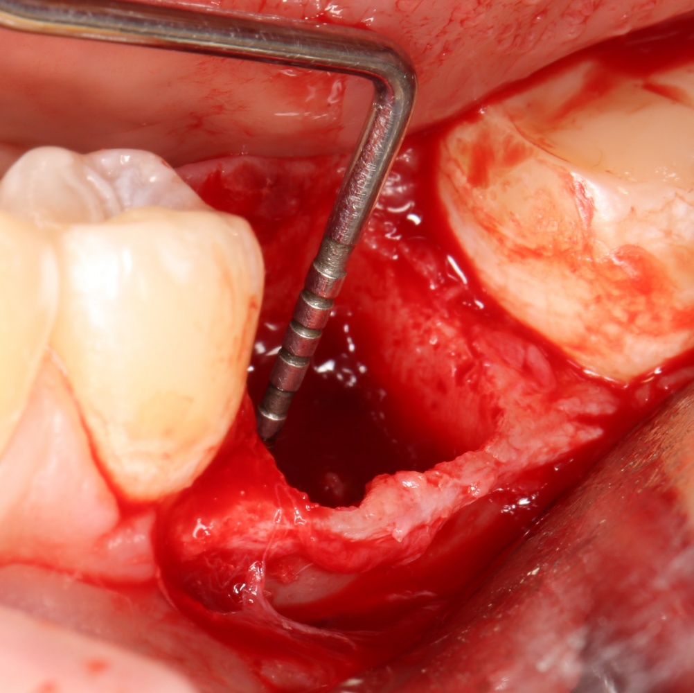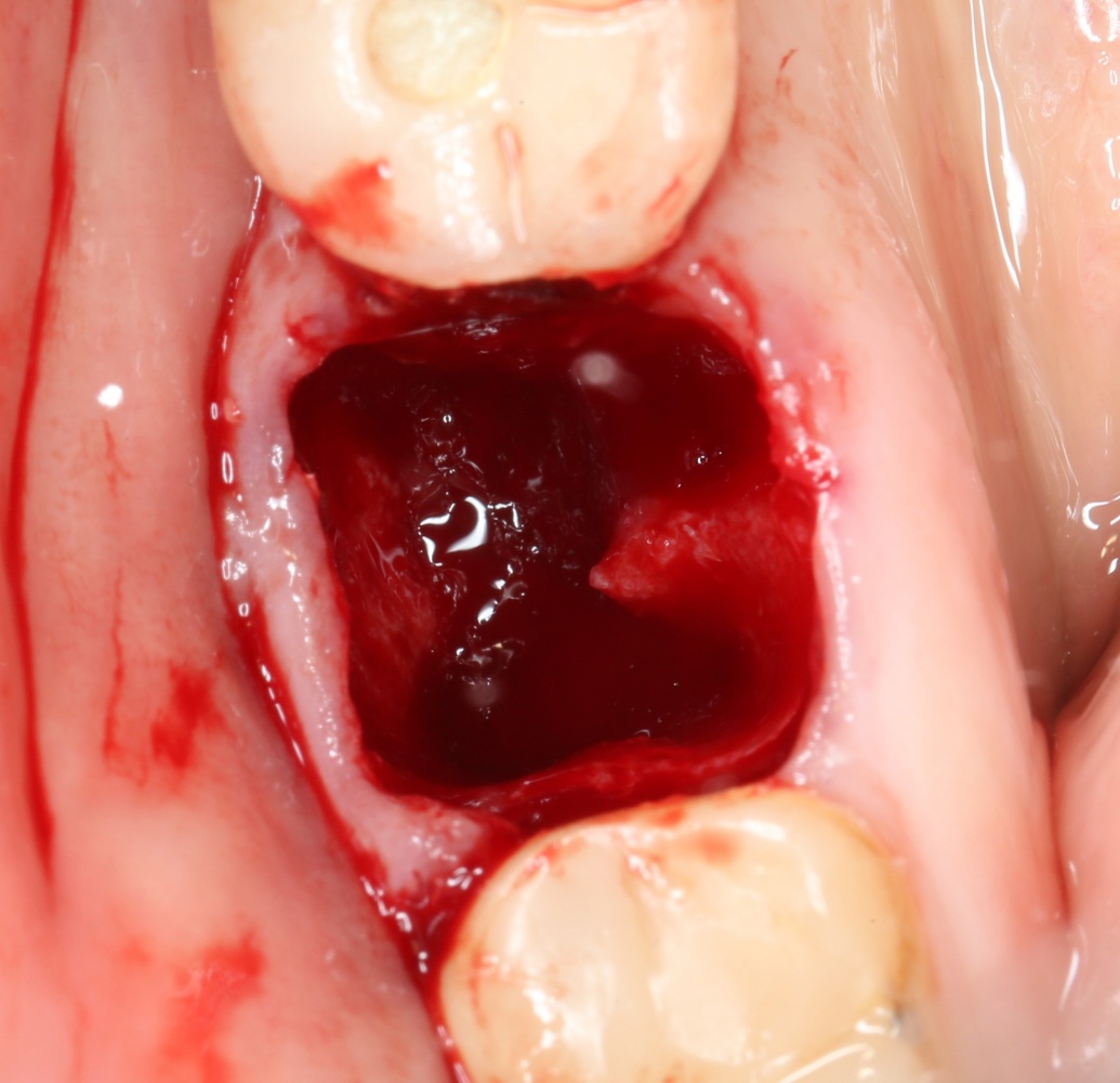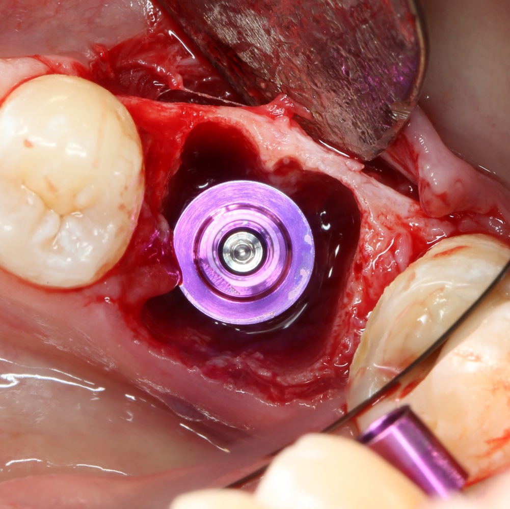 Напомню, что в таких случаях решение об установке импланта принимается только после того, как зуб удален, поскольку оставшиеся после удаления зуба ткани должны обеспечить хоть какую-то стабильность импланта. Если он удерживается в получившейся лунке — это хорошо. Если не удерживается — плохо, переходим к отсроченной имплантации. В общих чертах, завершение операции установкой импланта, в данном случае — штука непредсказуемая, и целиком зависит от возможности его стабилизировать.