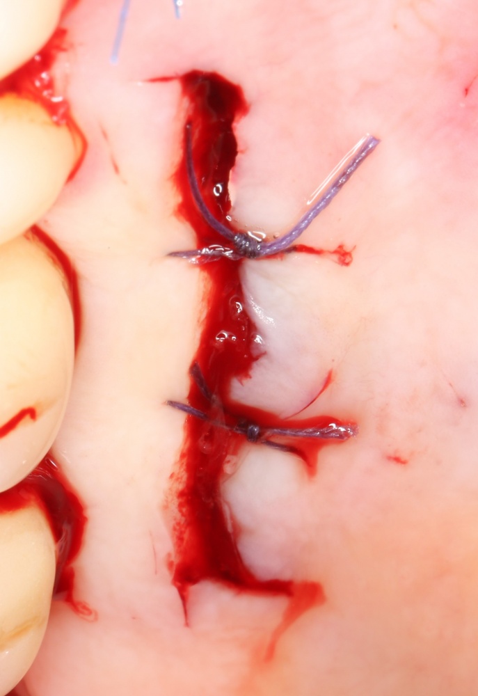 Мукогингивальные операции нередко требуют очень большого количества лигатур (швов), причём в очень неудобных местах. Это не может не беспокоить, поскольку усики узелков втыкаются в слизистую раздражают полость рта. Это сложно, но… это нужно пережить. Иногда (но далеко не всегда) можно использовать специальные защитные мази, но лучше просто подождать до снятия швов.