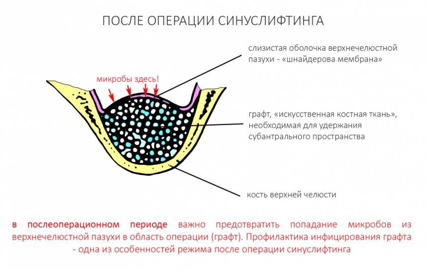 Синуслифтинг (или субантральная аугментация) является самой распространенной остеопластической операцией в мире. Фактически, её приходится делать 92% пациентов, если речь идёт об установке имплантатов в область боковых зубов верхней челюсти. НО, в отличие от других остеопластических операций (НКР, АТККФ и т. д.), операция синуслифтинга имеет ряд особенностей, накладывающих отпечаток, в том числе, и на реабилитационный период: в частности, область вмешательства находится, непосредственно, под полостью носа и отделена от неё тонкой слизистой оболочкой (т. н. «шнайдеровой мембраной»), выстилающей верхнечелюстную пазуху, при этом, в самой пазухе существует своя микрофлора, которая может быть опасна для графта. Именно поэтому основные наши усилия в послеоперационном периоде направлены на сохранение целостности шнайдеровой мембраны и предотвращение инфицирования области операции из полости носа.