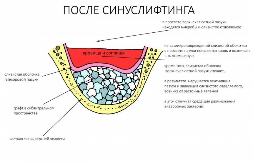 Отек, неприятные ощущения, наличие операционной раны и швов серьезно осложняют гигиеническую обстановку в полости рта. Как результат, зубной налёт скапливается даже в местах, далёких от места хирургического вмешательства. Попадание частичек зубного налёта в послеоперационную рану может привести к осложнениям — усилению воспаления, развитию гнойного процесса и т. д. И шансы на благоприятный исход падают, особенно это касается случаев сочетания синуслифтинга с немедленной имплантацией и остеопластикой.