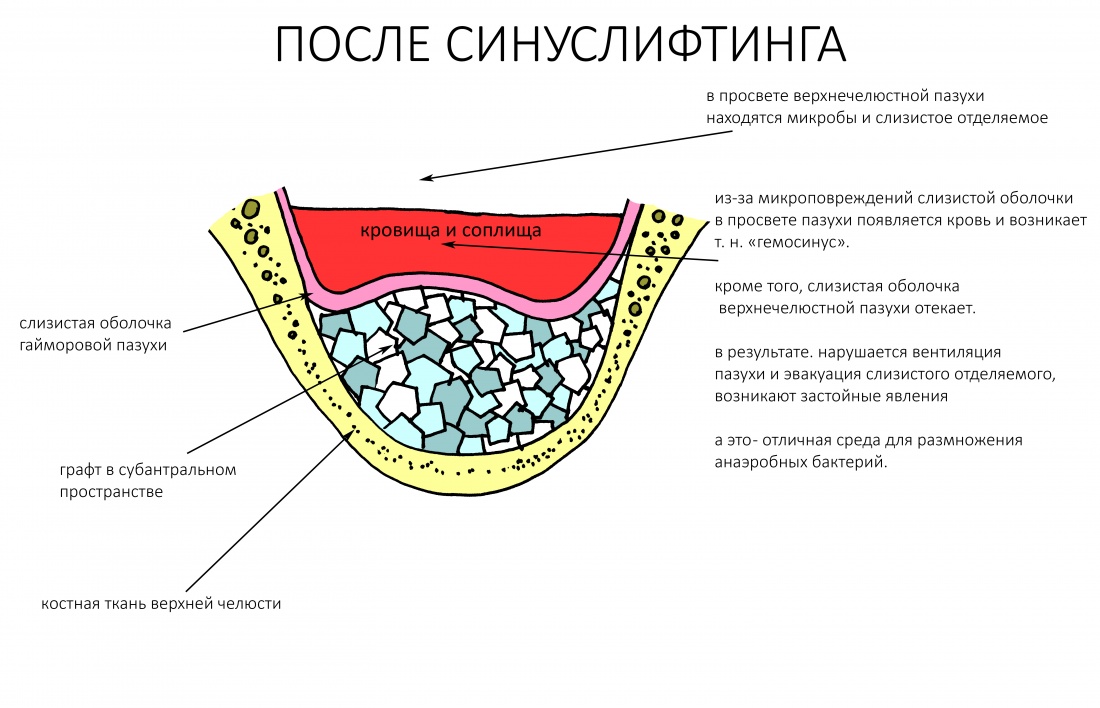 Отек, неприятные ощущения, наличие операционной раны и швов серьезно осложняют гигиеническую обстановку в полости рта. Как результат, зубной налёт скапливается даже в местах, далёких от места хирургического вмешательства. Попадание частичек зубного налёта в послеоперационную рану может привести к осложнениям — усилению воспаления, развитию гнойного процесса и т. д. И шансы на благоприятный исход падают, особенно это касается случаев сочетания синуслифтинга с немедленной имплантацией и остеопластикой.