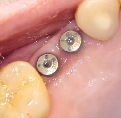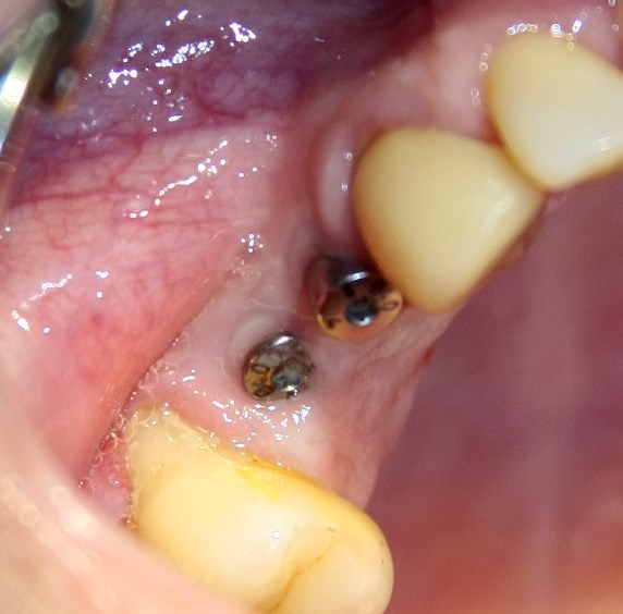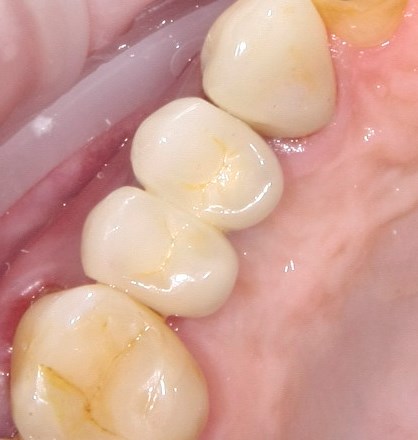 На импланты премоляров устанавливаются металлокерамические коронки на индивидуальных абатментах. Фотография сразу после протезирования: