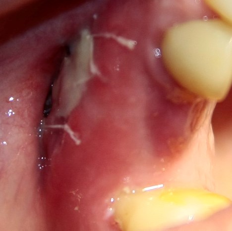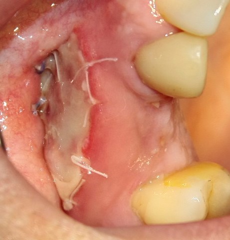 После чего она фиксируется узловыми швами к надкостнице и краям слизистой раны. В данном случае — Gore-Tex 6-0.
