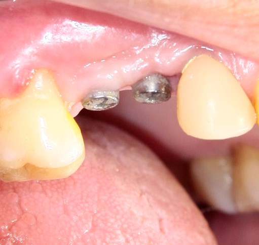 К нам в клинику обратилась пациентка, возраст чуть более 70 лет. Несколько месяцев назад ей поставили два импланта Astratech в область отсутствующих премоляров верхней челюсти, при этом не был учтен существующий объем мягких и твердых тканей. Около месяца назад на импланты установили формирователи десны: