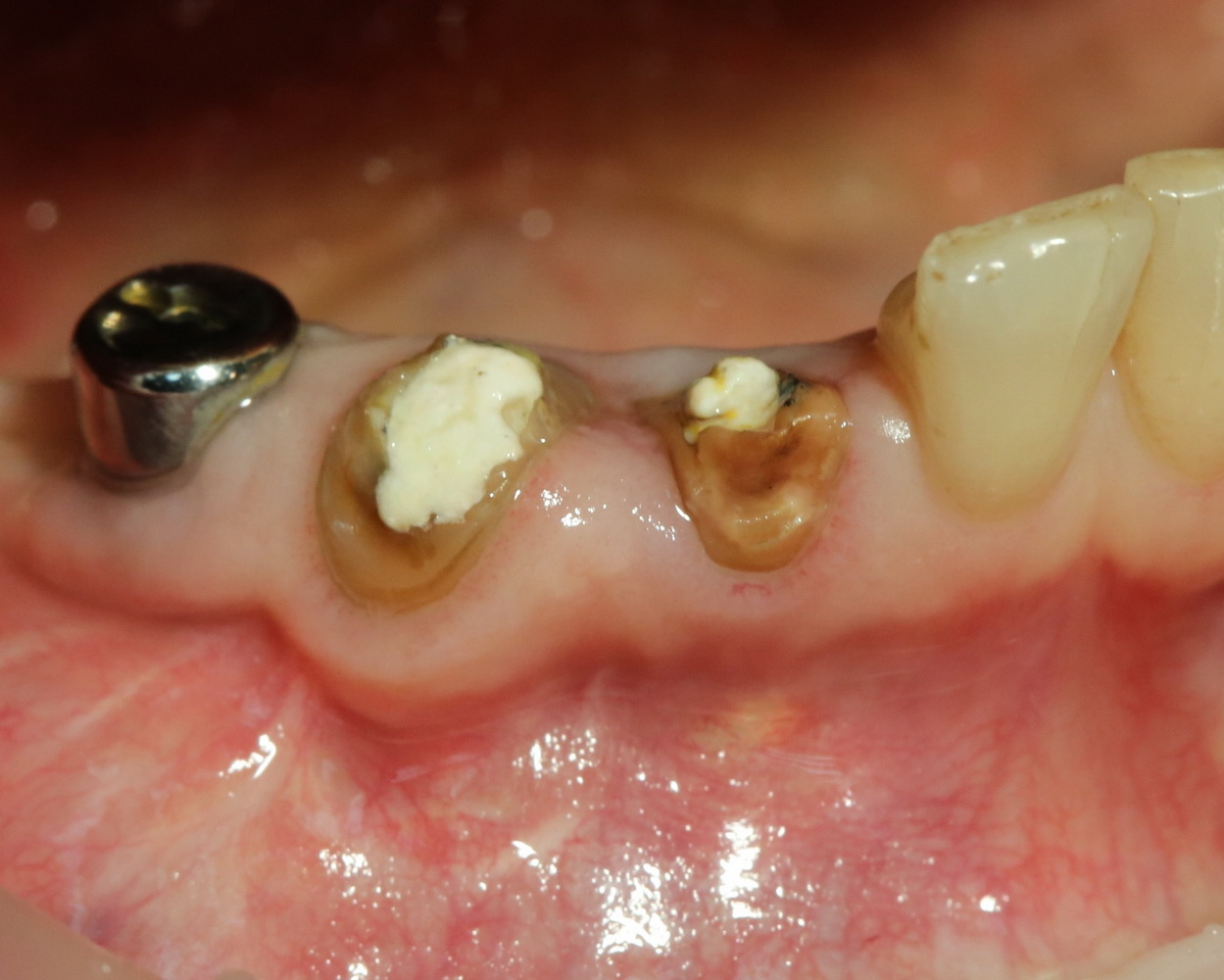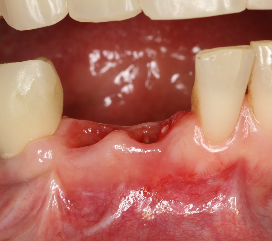 На фотографиях ниже видно, как выглядят лунки зубов после удаления: тонкие, почти прозрачные вестибулярные стенки при сохраненной высоте альвеолярного гребня.