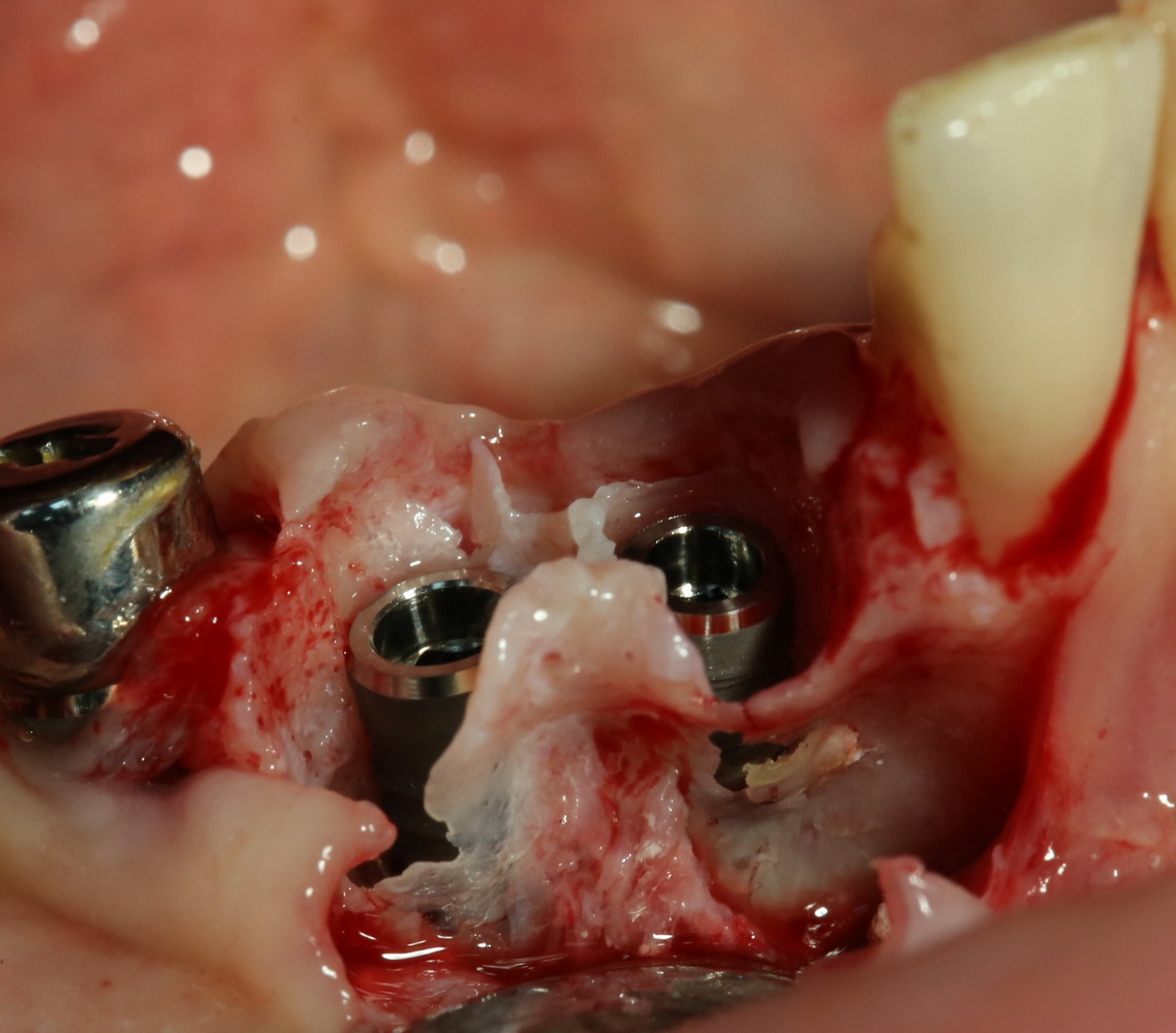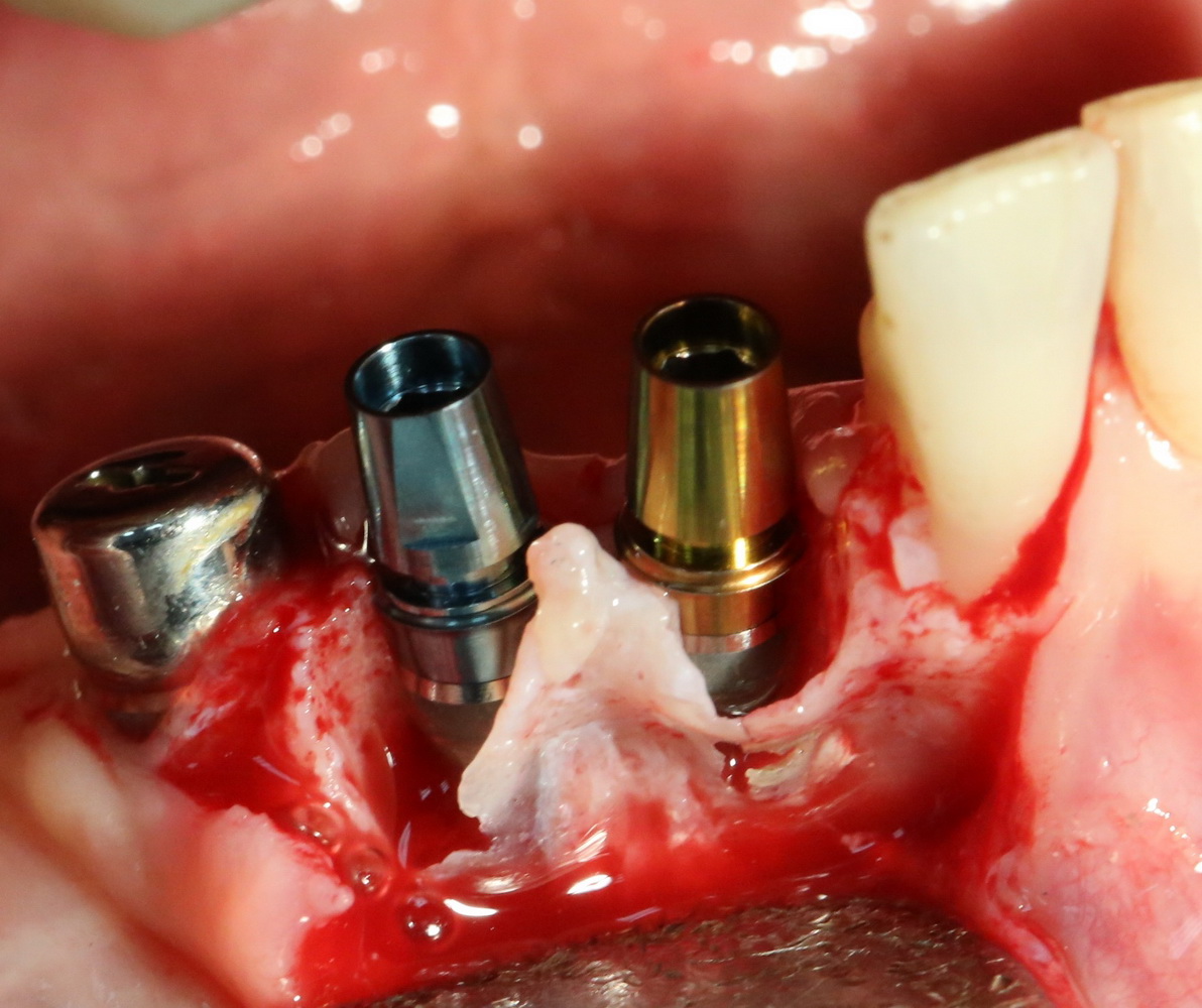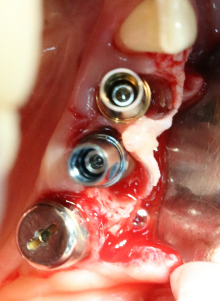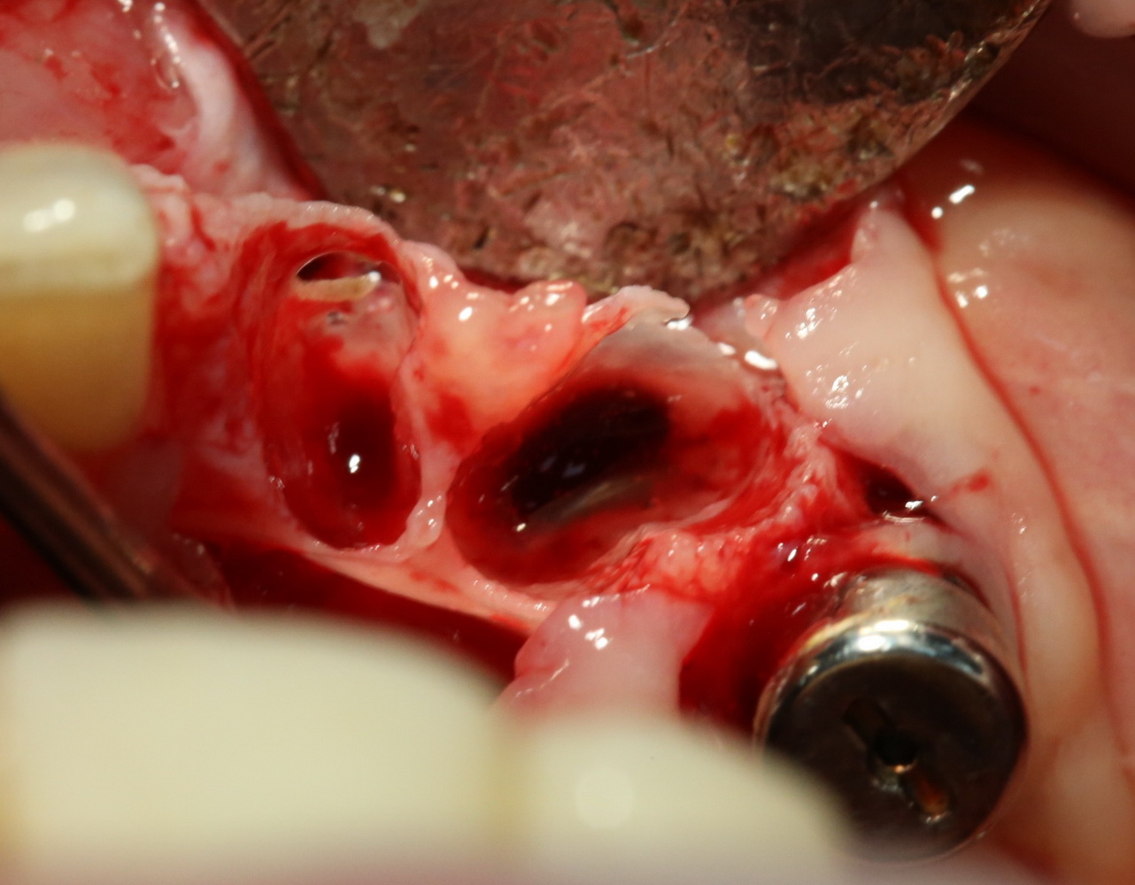 В случаях, подобных этому, я стараюсь ничем не заполнять лунку с установленным имплантом. Формирующийся кровяной сгусток сам по себе является прекрасным субстратом для регенерации костной ткани. Но для того, чтобы он удержался в лунке, не нужно проводить ее кюретаж после удаления зуба.