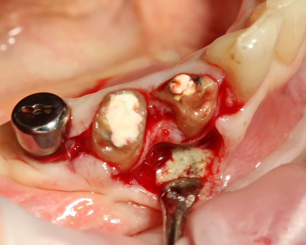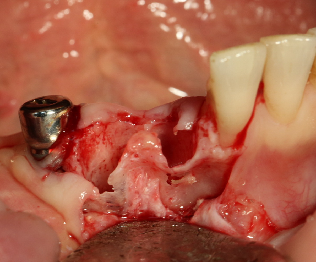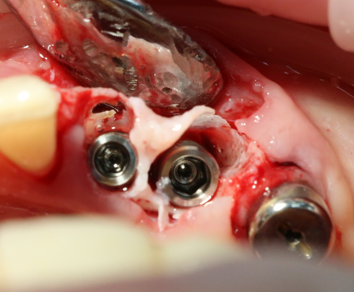 В случаях, подобных этому, я стараюсь ничем не заполнять лунку с установленным имплантом. Формирующийся кровяной сгусток сам по себе является прекрасным субстратом для регенерации костной ткани. Но для того, чтобы он удержался в лунке, не нужно проводить ее кюретаж после удаления зуба.