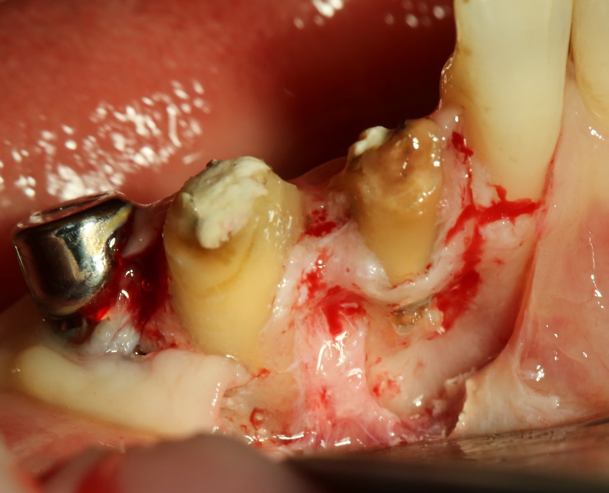 Аккуратно промываем рану физраствором, удаляем все ее содержимое. На левой фотографии хорошо заметна как сама перфорация корня и вестибулярной стенки костной ткани, так и ожог надкостницы, вызванный медикаментами для обработки каналов.