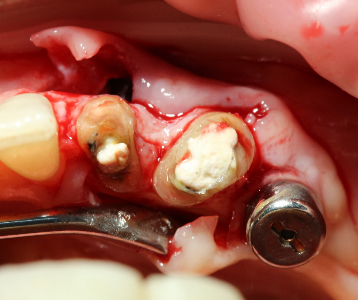 В 2010 году мы применили методику немедленной имплантации на многокорневых зубах (до этого работали, исключительно, с однокорневыми зубами: резцами, клыками, иногда — премолярами). Сначала были сомнения в возможности качественной стабилизации имплантов в больших лунках и герметичного закрытия операционной раны. Однако, как показала практика, при применении данной методики, а лунка зуба с имплантом нормально заживает и эпителизируется вторичным натяжением.
