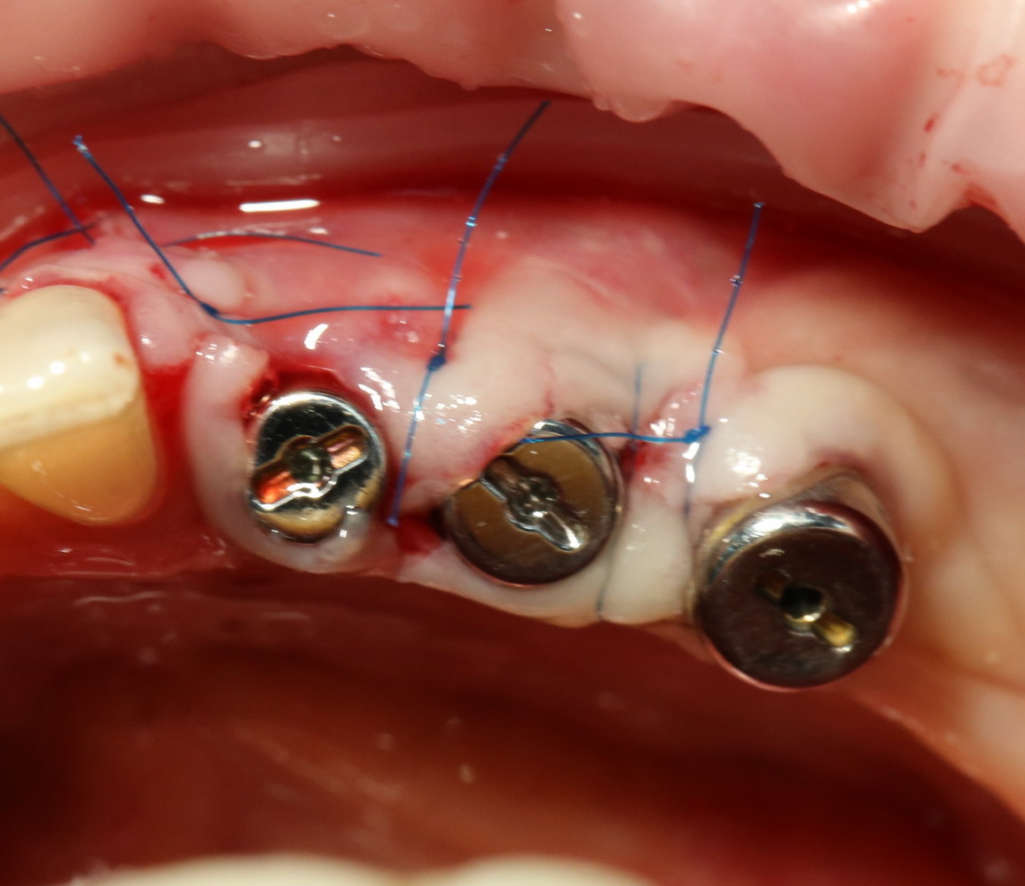 На импланты устанавливаются формирователи десны, а на слизистую накладываются швы. Для операций имплантации я использую, исключительно, нерезорбируемый шовный материал. В данном случае — Prolene 6-0.