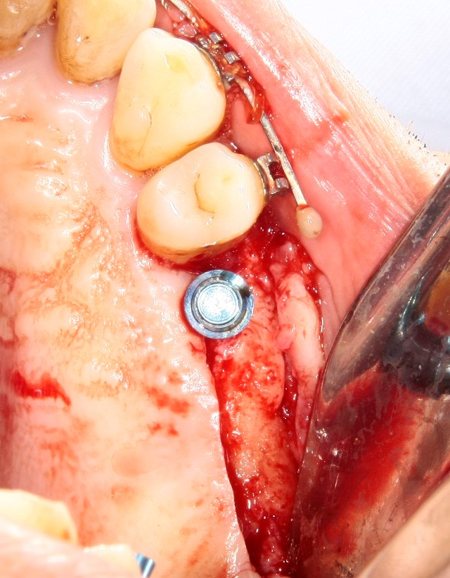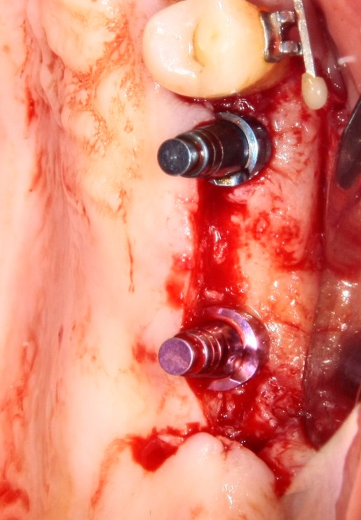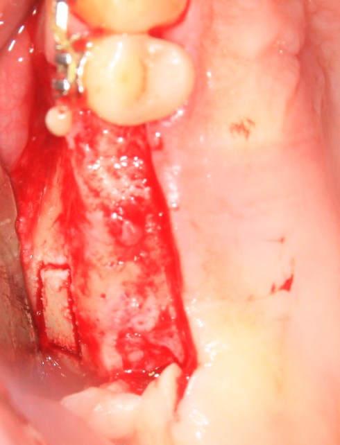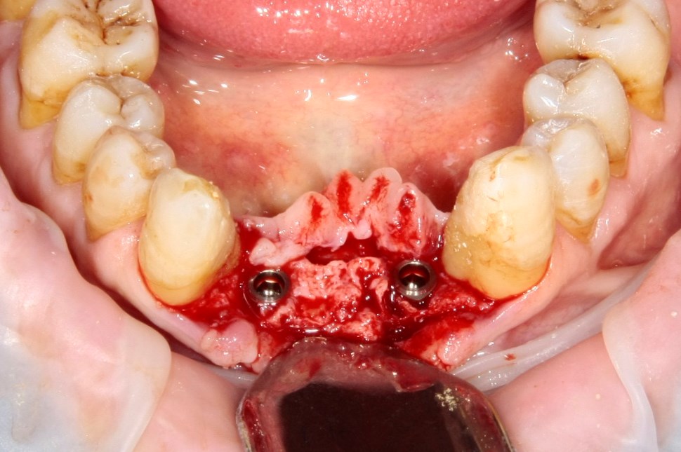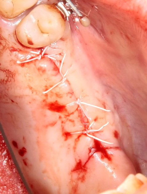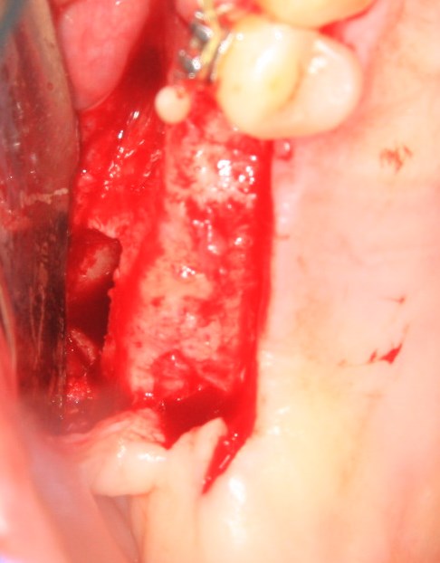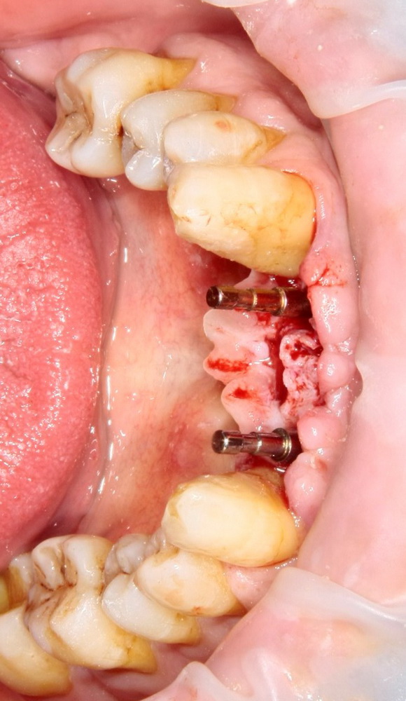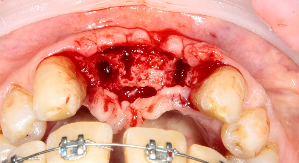 Слизистая оболочка отслаивается до нормально обозримого операционного поля. Мы видим лунки недавно удаленных зубов: