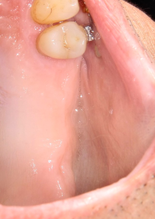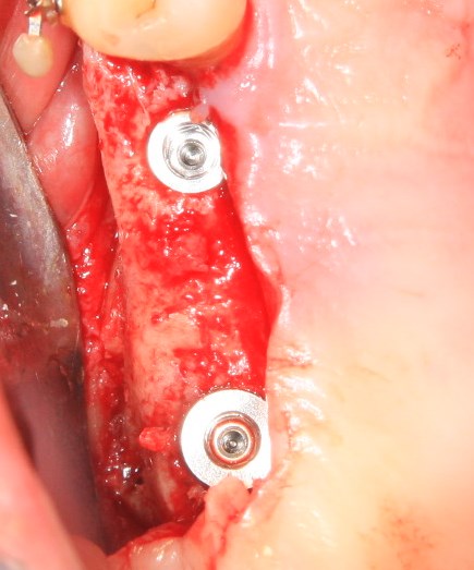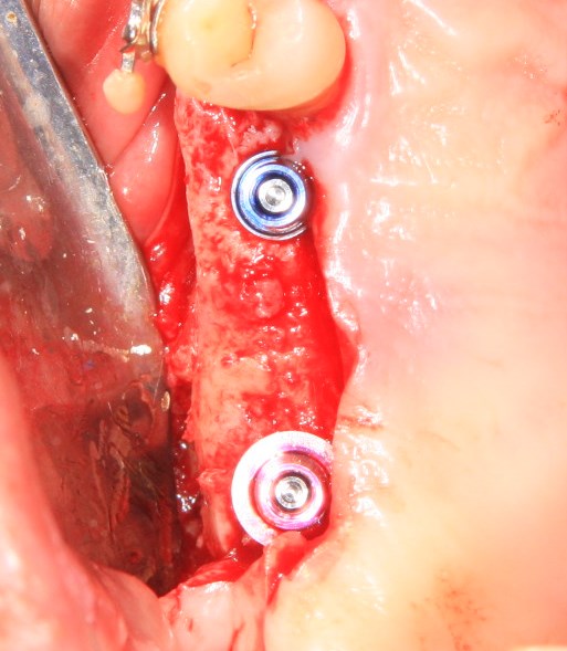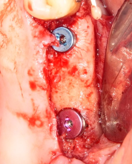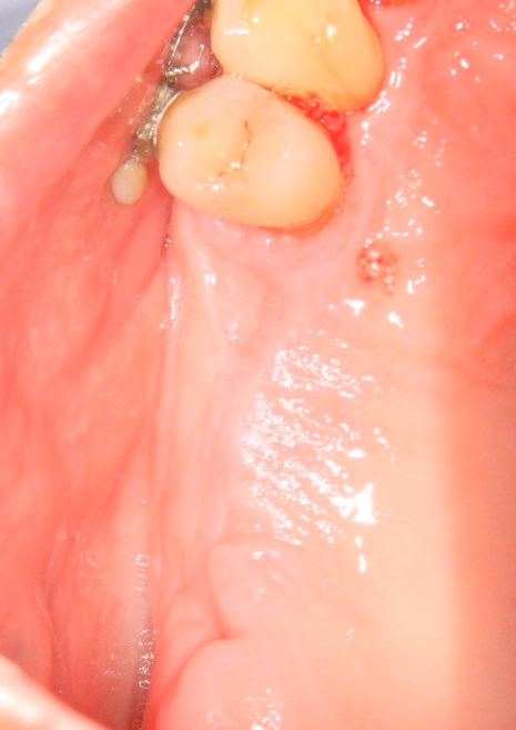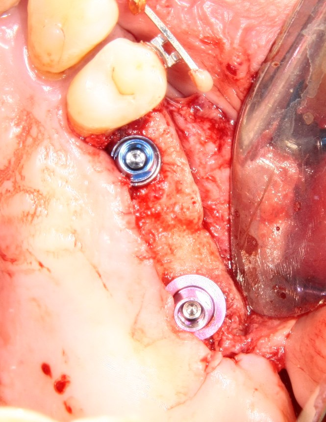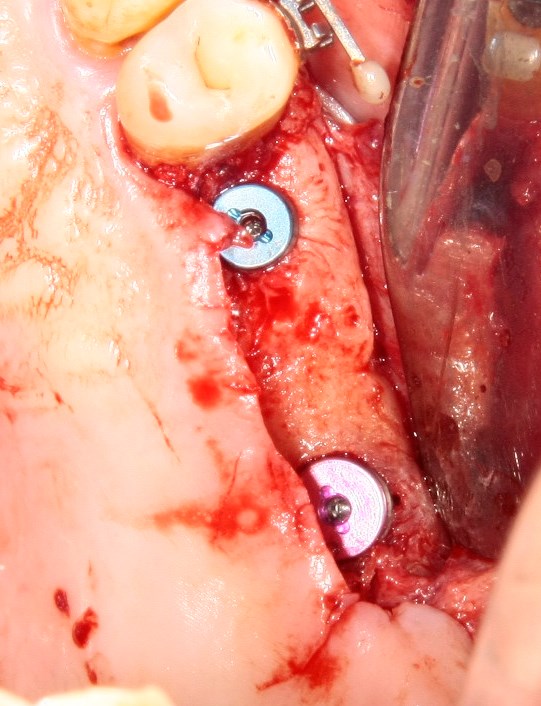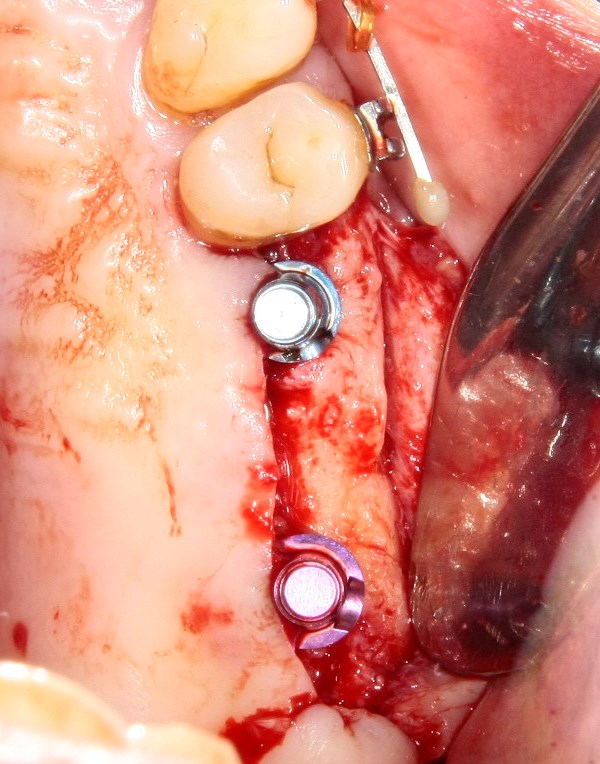 Слизистая оболочка отслаивается до нормально обозримого операционного поля. Мы видим лунки недавно удаленных зубов: