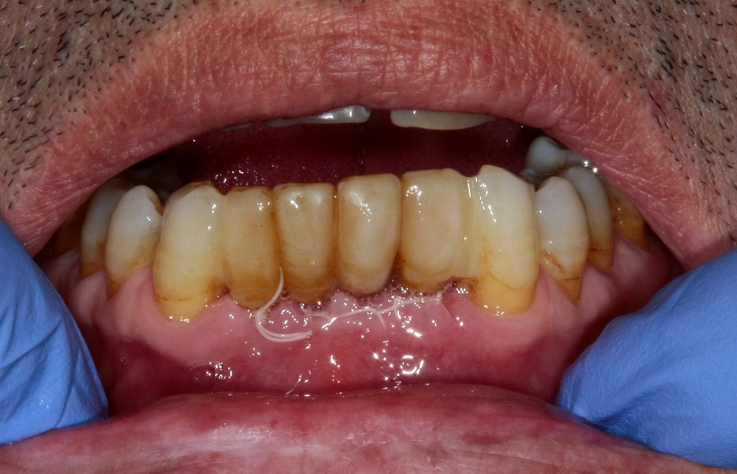 Исходная ситуация: пациенту чуть больше 60 лет, тяжелый пародонтит, вызванный проблемами с прикусом. В последнее время отмечает, что после потери зубов на верхней челюсти, оставшиеся зубы «поехали» в разные стороны. Был на консультации в другой клинике, где предложили удалить все зубы на верхней челюсти и изготовить съемный протез — пародонтит же!