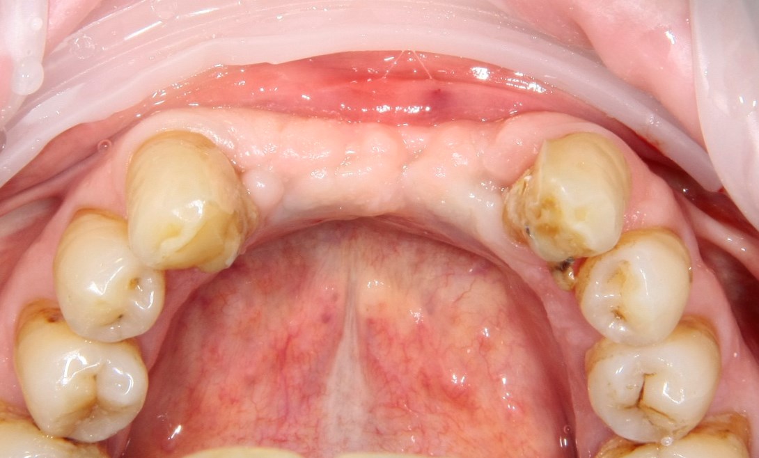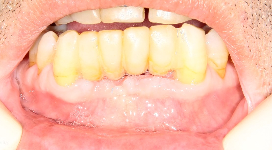 - фронтальный сегмент. Из-за давления протеза еще больше уменьшится высота десны, а она и так в дефиците.
