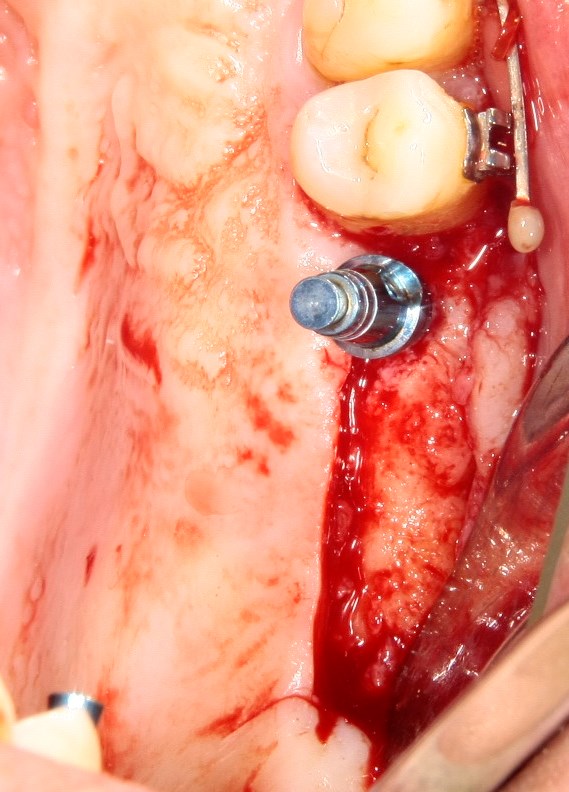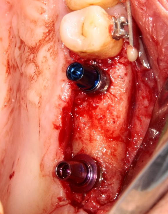 Затем устанавливаются импланты. В данном случае я выбрал импланты Friadent Xive 3.4×13 мм. В принципе, можно было бы использовать имплантаты диаметром 3,0 мм, специально предназначенные для нижних резцов, но, к сожалению, выбор супраструктур для них весьма ограничен: