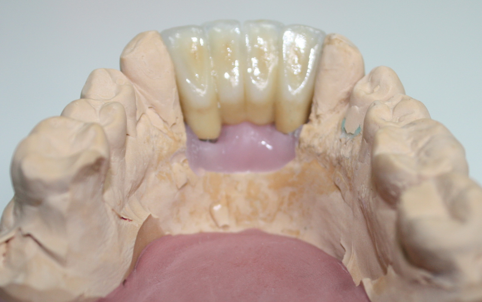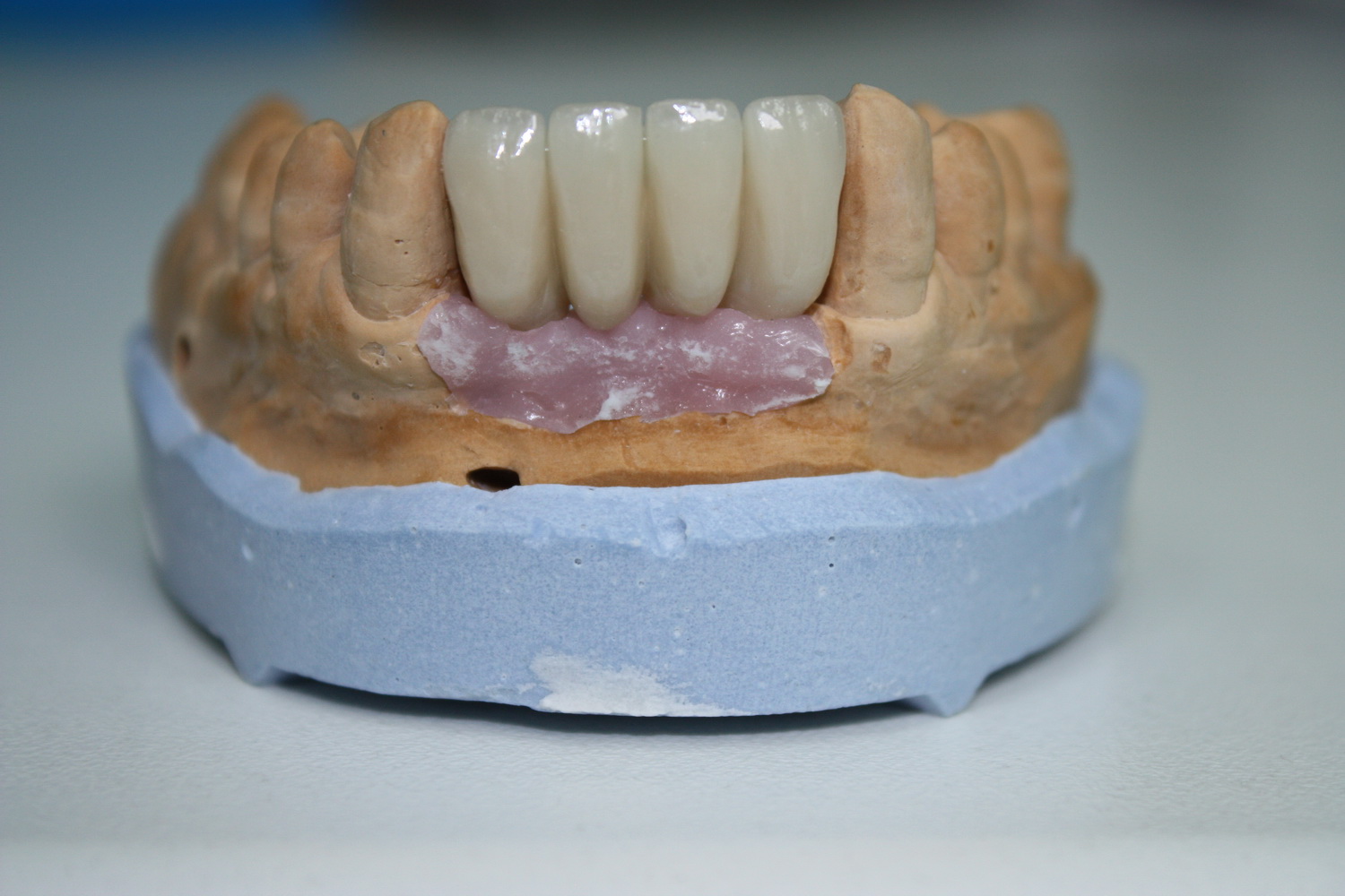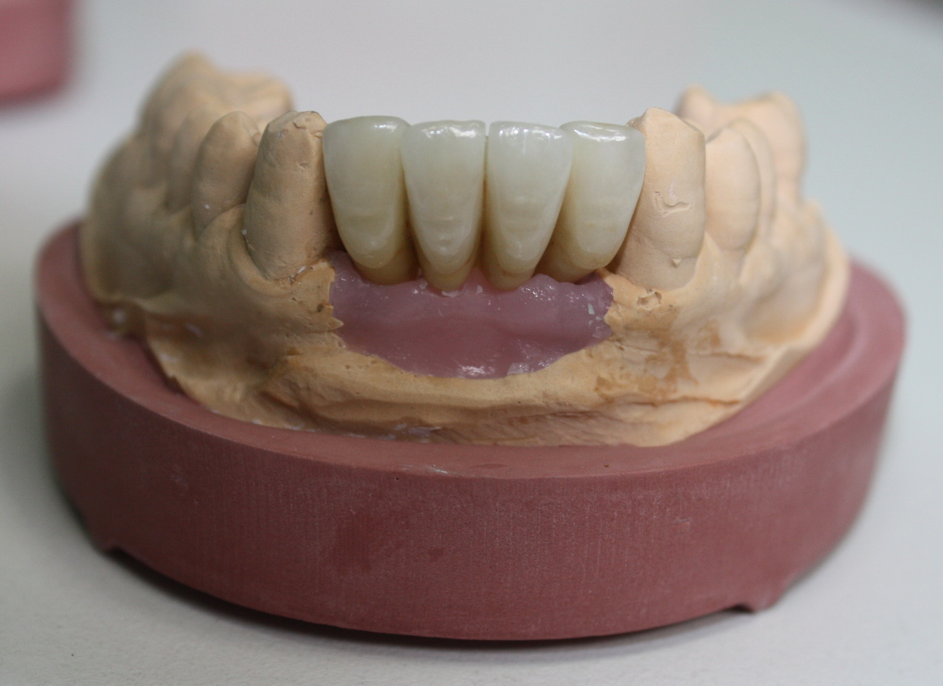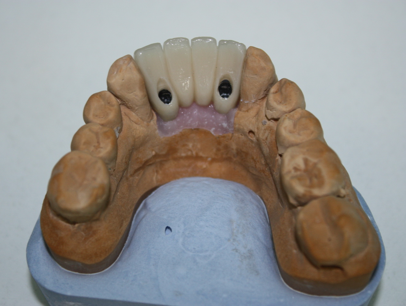 Затем, зубной техник в лаборатории изготавливает временный протез с опорой на импланты: