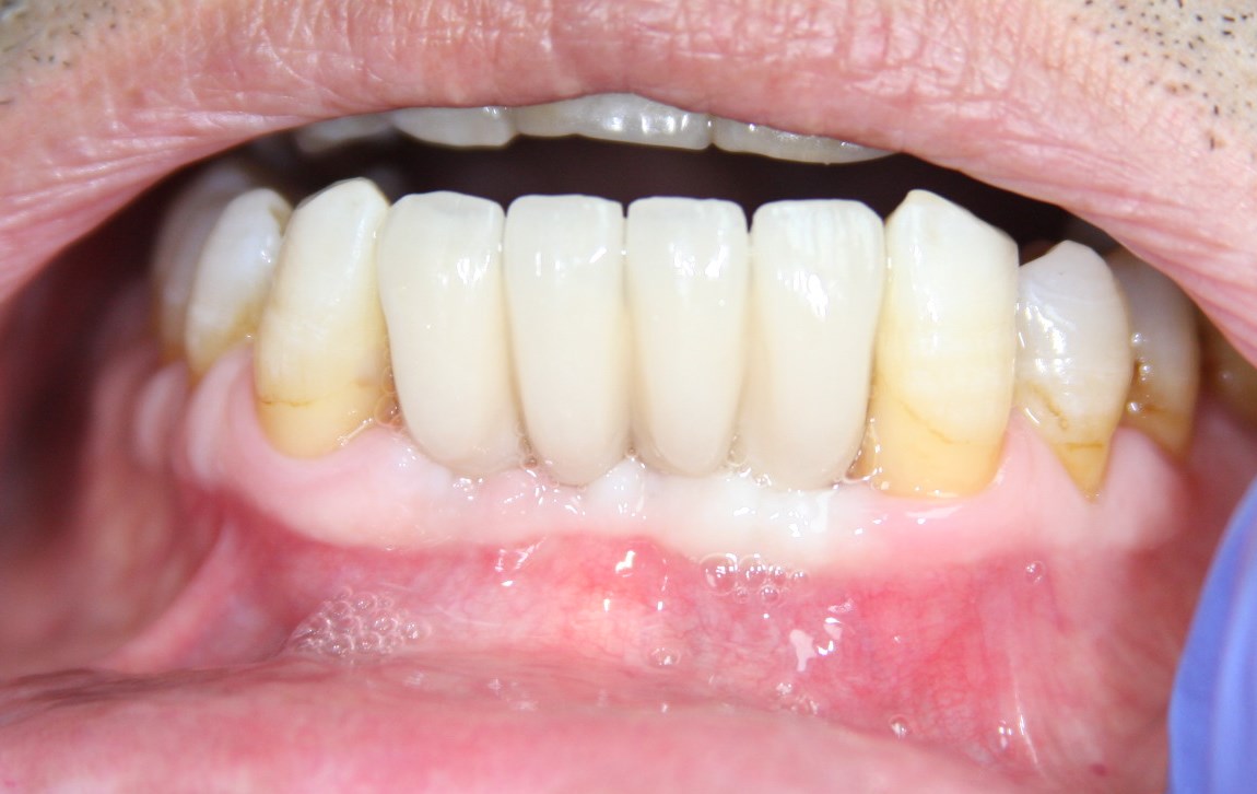 Десна в области нижних резцов приобрела нормальный цвет. Пациент вовсю пользуется новыми зубами, несмотря на то, что коронки временные.