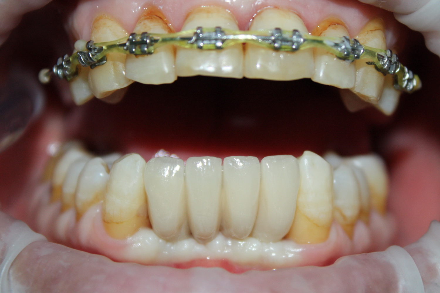 Верхняя челюсть: ортодонтическое лечение — 4 импланта в область пятых и седьмых зубов — временное протезирование — постоянное протезирование.