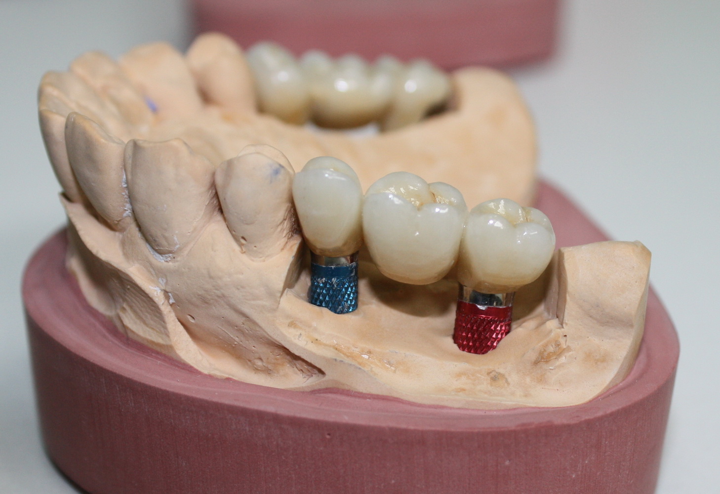 С имплантами дела обстоят иначе. Сначала на импланты фиксируются транферы, затем слепки снимаются таким образом, чтобы эти самые трансферы остались в оттиске. К трансферам фиксируются аналоги имплантов, которые потом остаются в модели, точно повторяя положение имплантов в полости рта. На аналоги имплантов подбираются и индивидуализируются абатменты — и только потом зубной техник приступает к изготовлению коронки по классической схеме: моделирование, литье, примерка, облицовка и т. д.