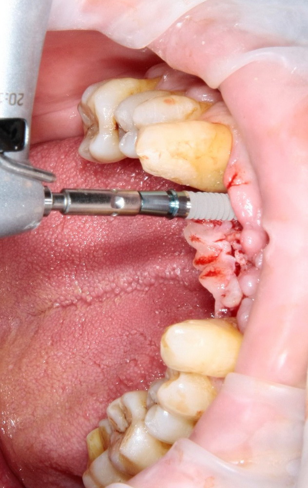 После чего спокойно приступаем к установке имплантов. Сначала устанавливаем имплантат пятого зуба: