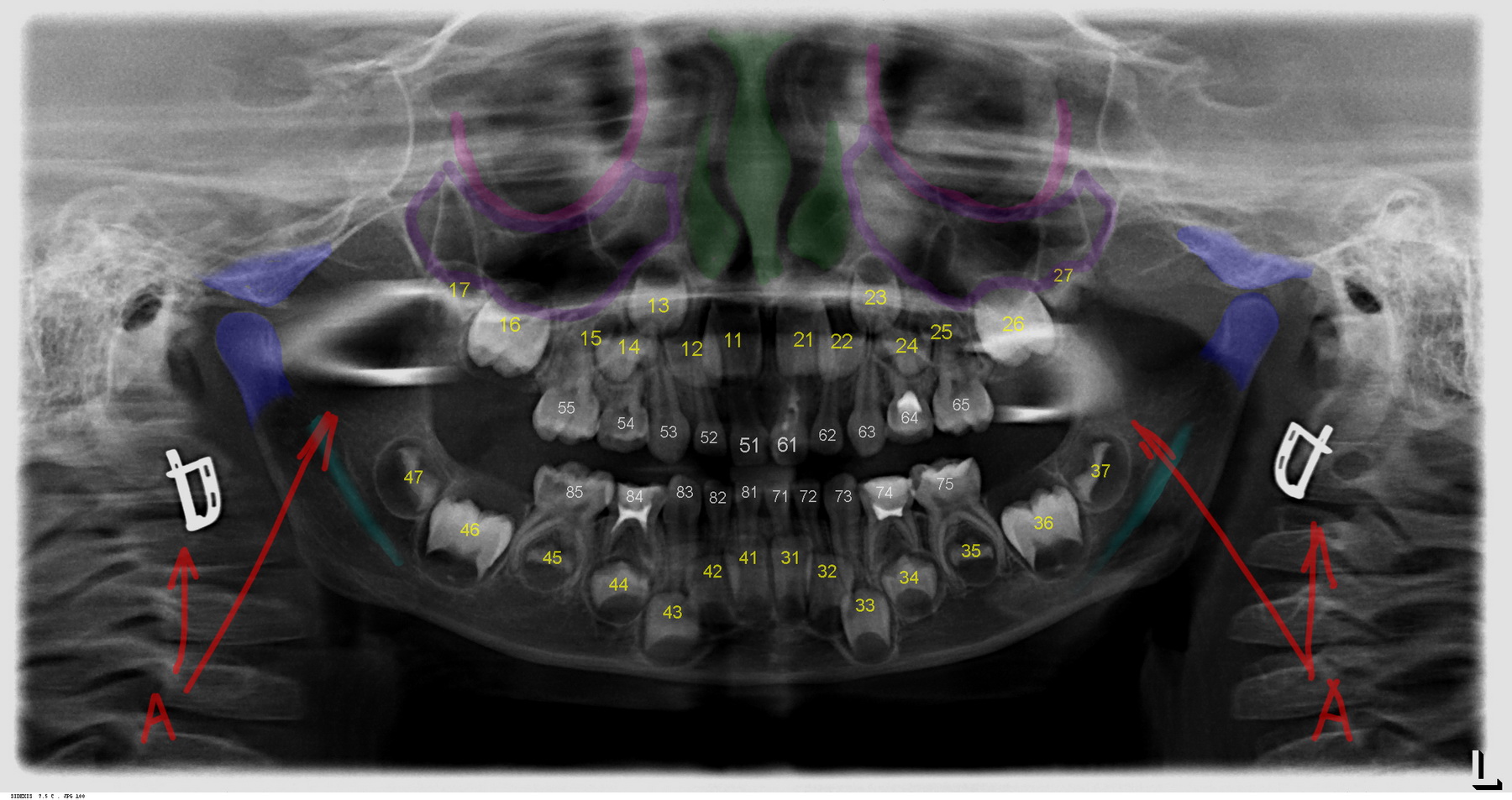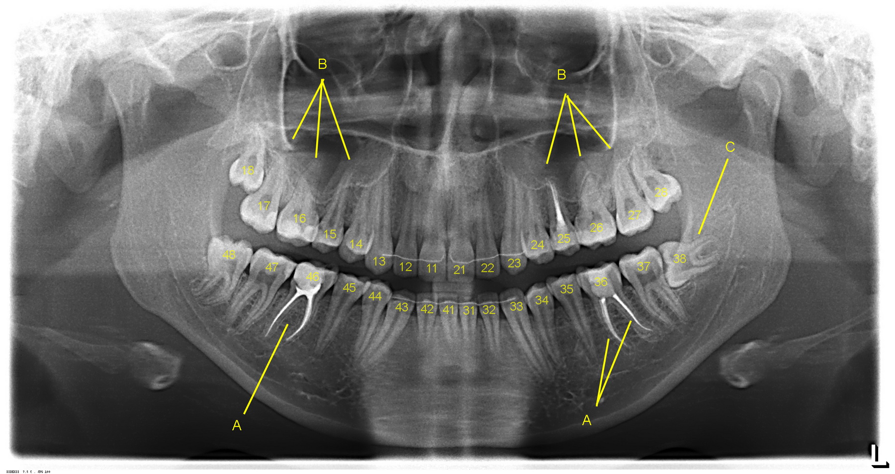 В современной стоматологии используется цифровое обозначение зубов. Вот так, как на расшифровке ортопантомограммы: