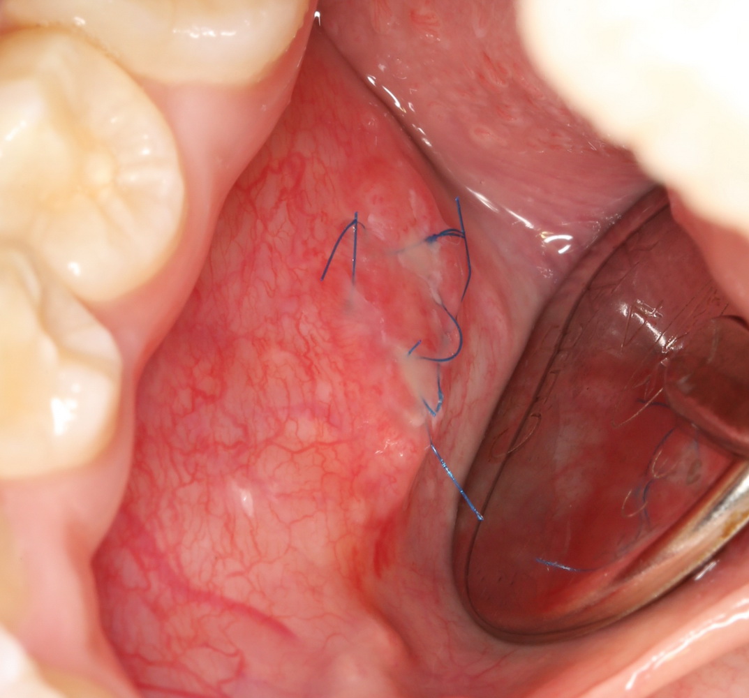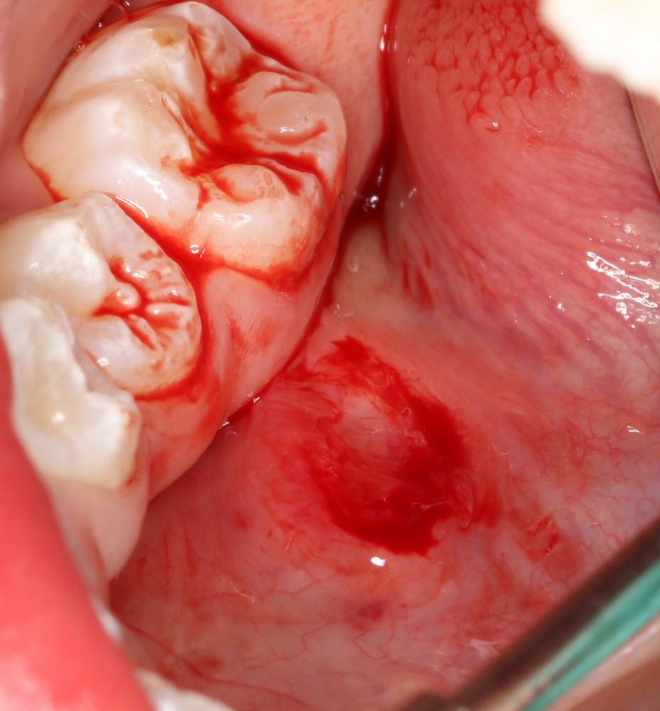 Тут есть нюанс. В данном случае всё просто. Но иногда дно ранулы находится глубоко в толще тканей, и физически невозможно вывести его «в ноль» со слизистой. В подобных ситуациях оболочка кисты рассекается и подшивается на уровне окружающей слизистой, а полость кисты, которая теперь стала просто углублением, заполняется йодоформной турундой или губкой. Ну, или можно метрогилом-солкосерилом-вазелином заполнить. Главное, чтобы не слиплись края).