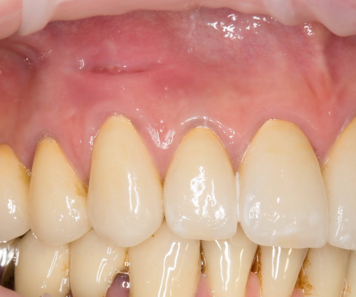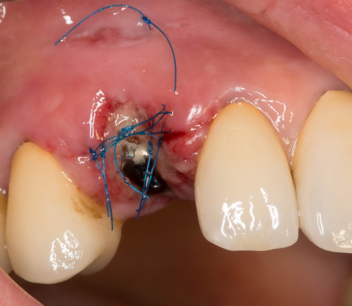- Сильно стянуть края раны. Плюсы — очень просто. Минусы — излишне сильное натяжение краев раны приводит к деградации прикрепленной слизистой оболочки и усиливает атрофические процессы в подлежащей костной ткани. Результат — полная потеря эстетического результата. Нельзя так.
