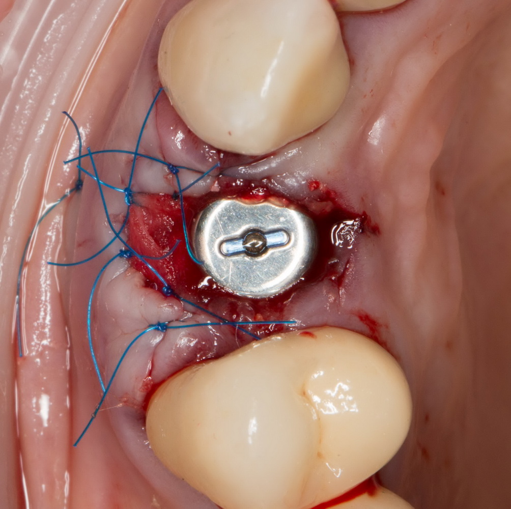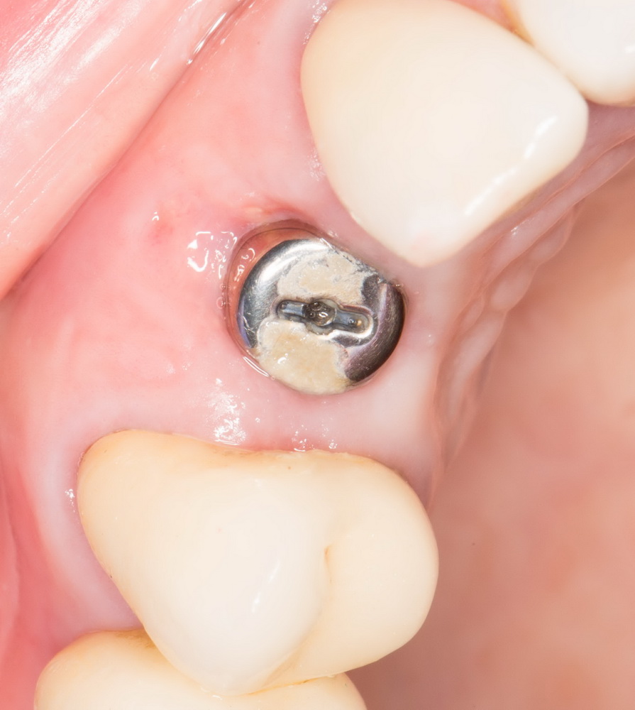 Коронка фиксируется винтом. Мы оставляем ее до момента интеграции импланта (несколько месяцев), плюс еще немного времени.