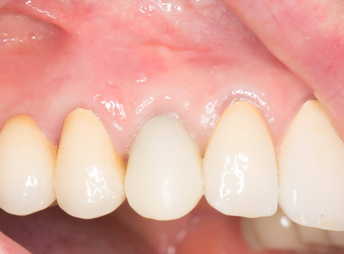 Обратите внимание на состояние десны. Проведенные после установки импланта манипуляции позволили не только ее сохранить, но и увеличили объем. Формирование адекватных контуров и объемов слизистой оболочки, особенно в эстетически значимой зоне — еще одно назначение временных коронок на импланты. Все же, формирователи — штука стандартная, в то время как контуры десны как у разных людей, так и у разных зубов, свои — и под каждый зуб десну нужно готовить индивидуально.