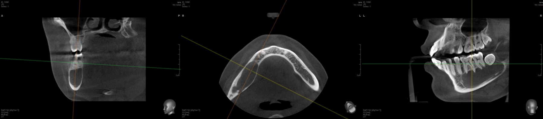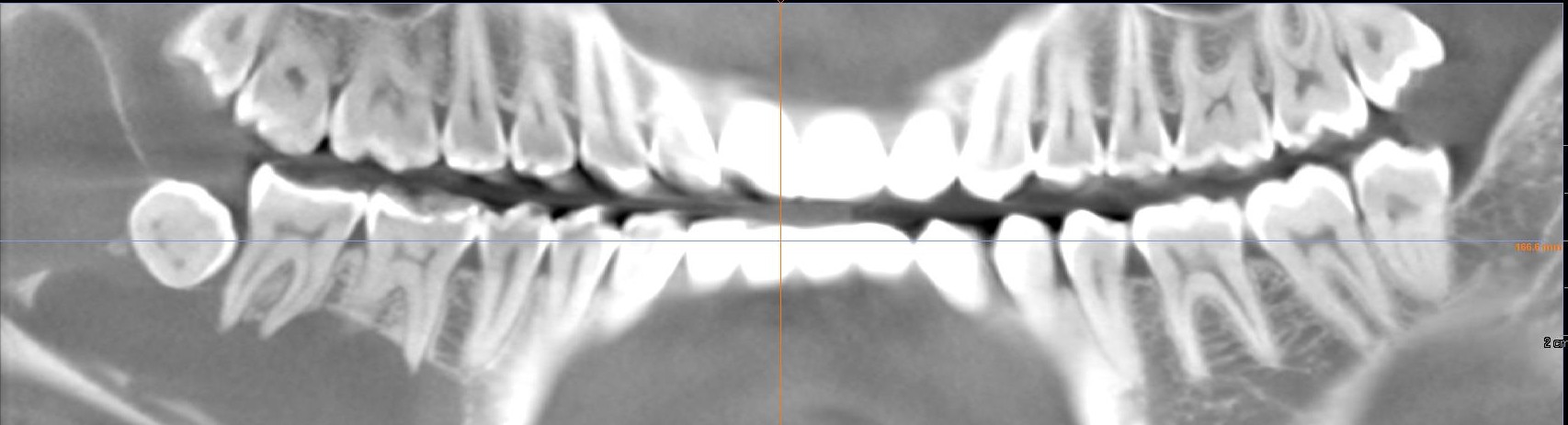 Примерно полтора года назад к нам в клинику обратилась молодая и красивая девушка. Все бы ничего, ничто ее не беспокоило, но вот однажды пошла она лечить зубки, и ей сделали панорамный снимок. Сделали панорамный снимок — забегали, заохали, послали на компьютерную томографию. Вот она: