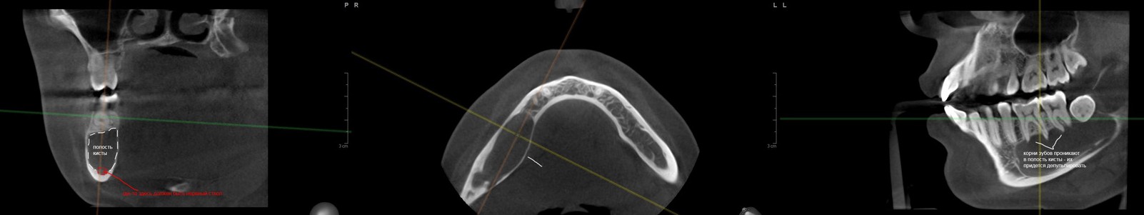 - Полость кисты очень большая, переходит с тела на ветвь нижней челюсти. Проблема решаема правильным доступом.
