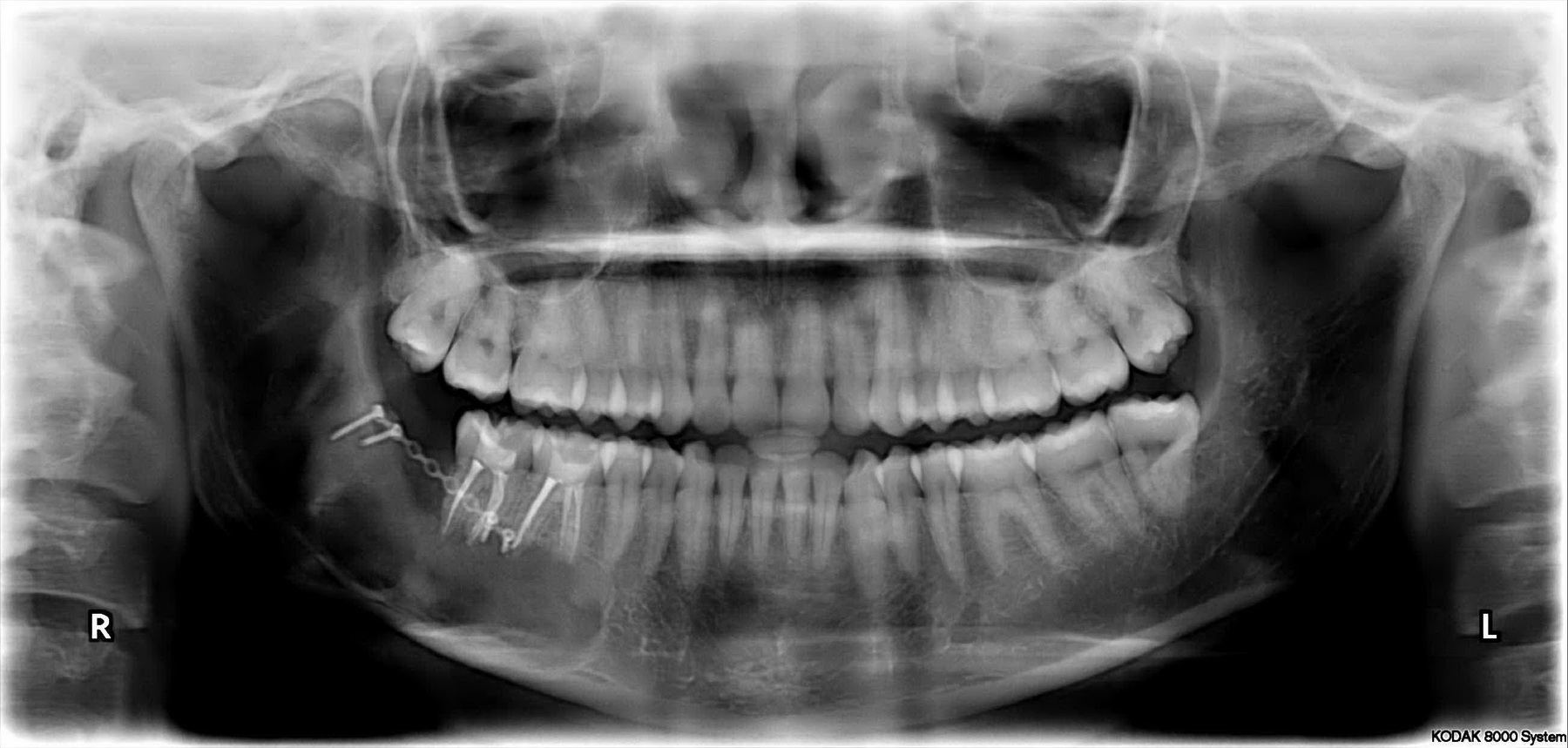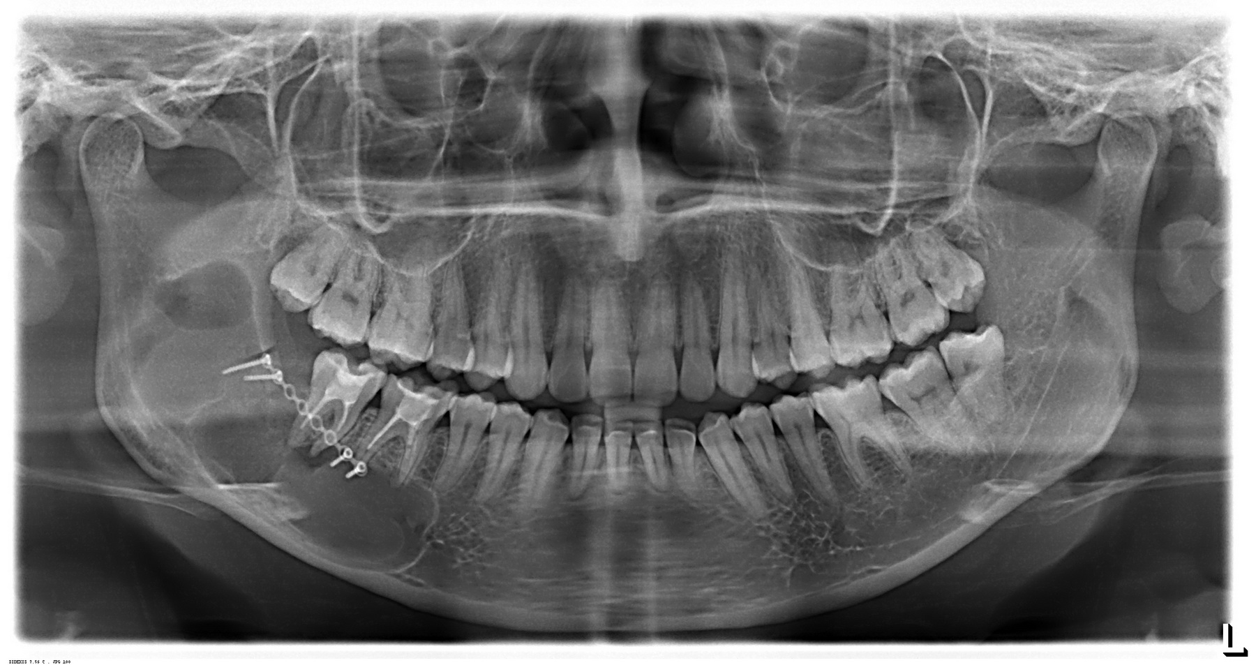 А на этой ортопантомограмме мы можем увидеть, почти окончательное восстановление костной ткани в зоне операции. Полость не только заполнилась костной тканью — появился характерный «ячеистый» рисунок, что говорит о нормальном процессе регенерации кости. Контуры костной полости пока видны, но такая картина может наблюдаться в течение нескольких лет после хирургического вмешательства.