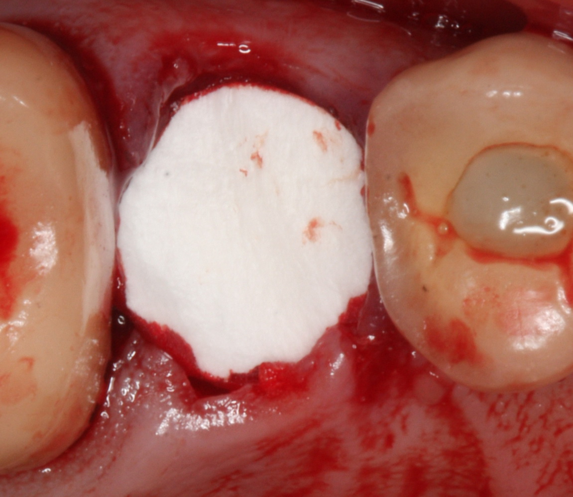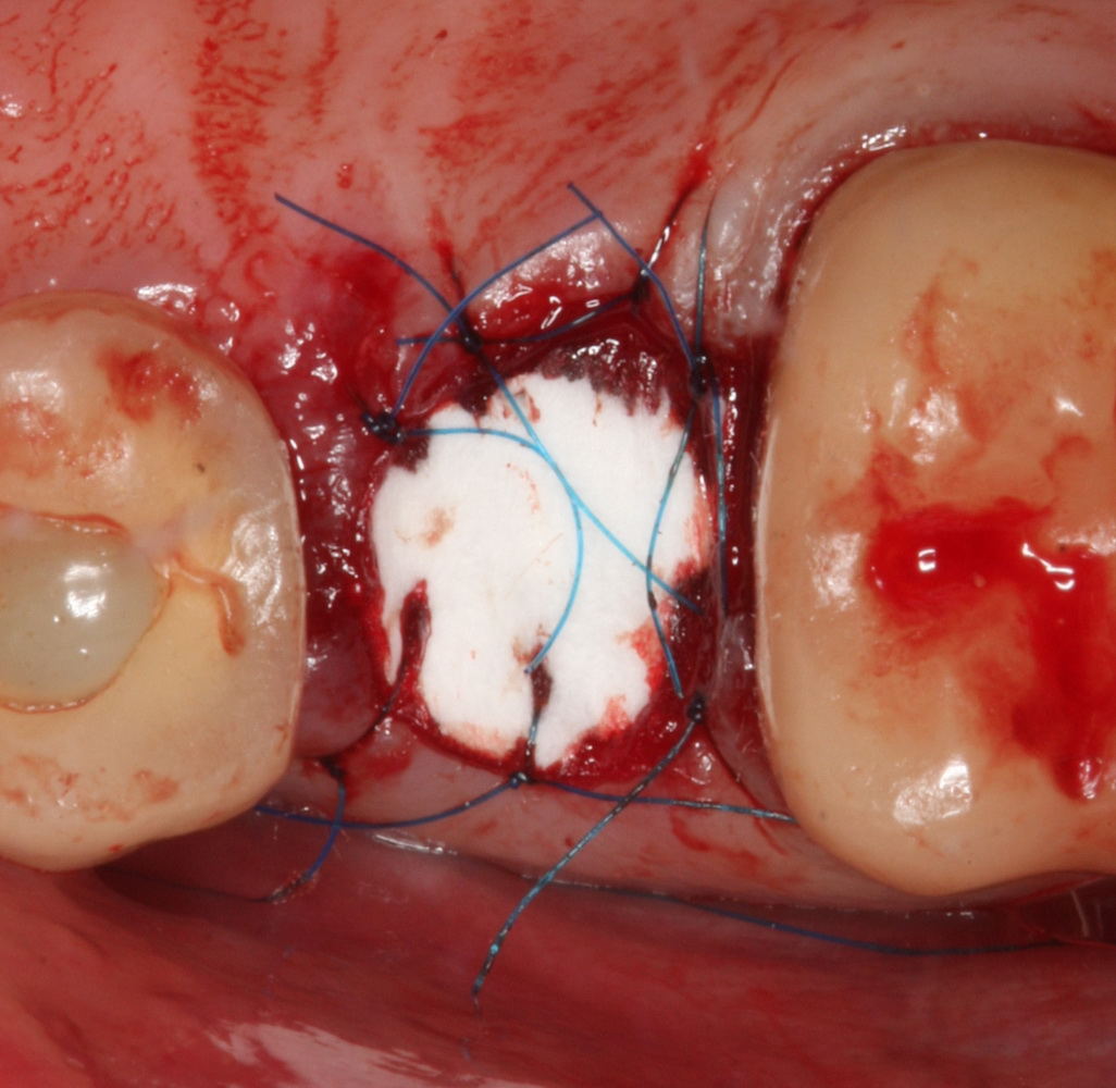 Натолкали в лунку биоматериала, прикрыли коллагеновой матрицей: