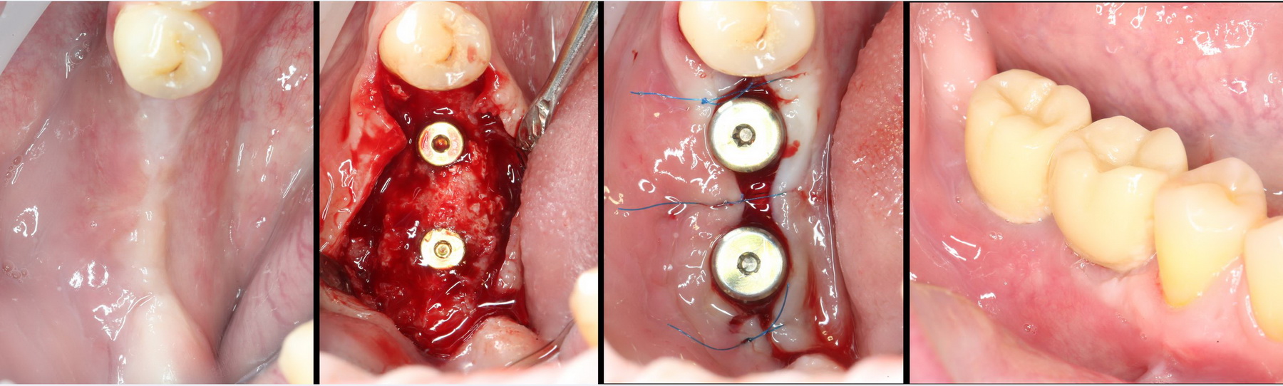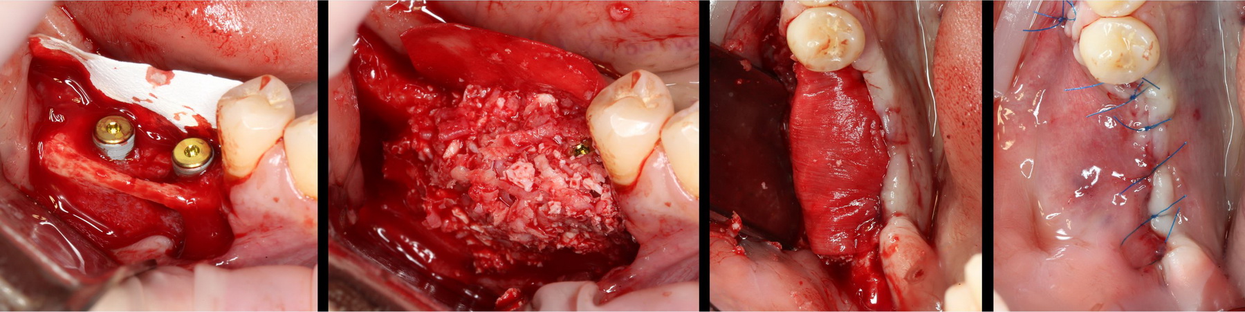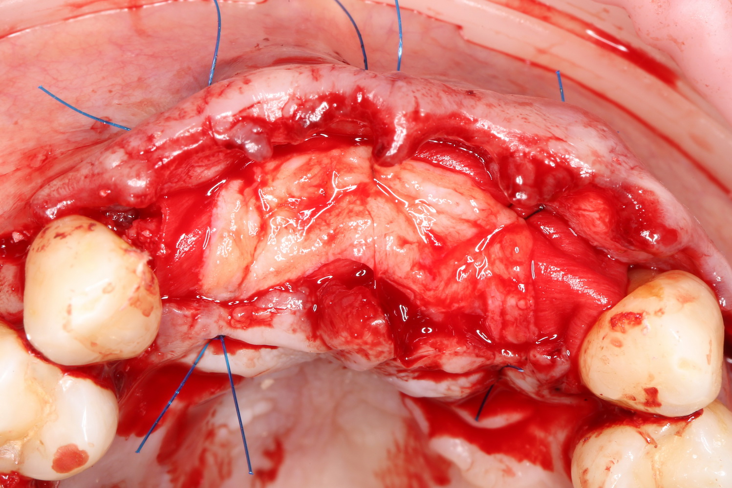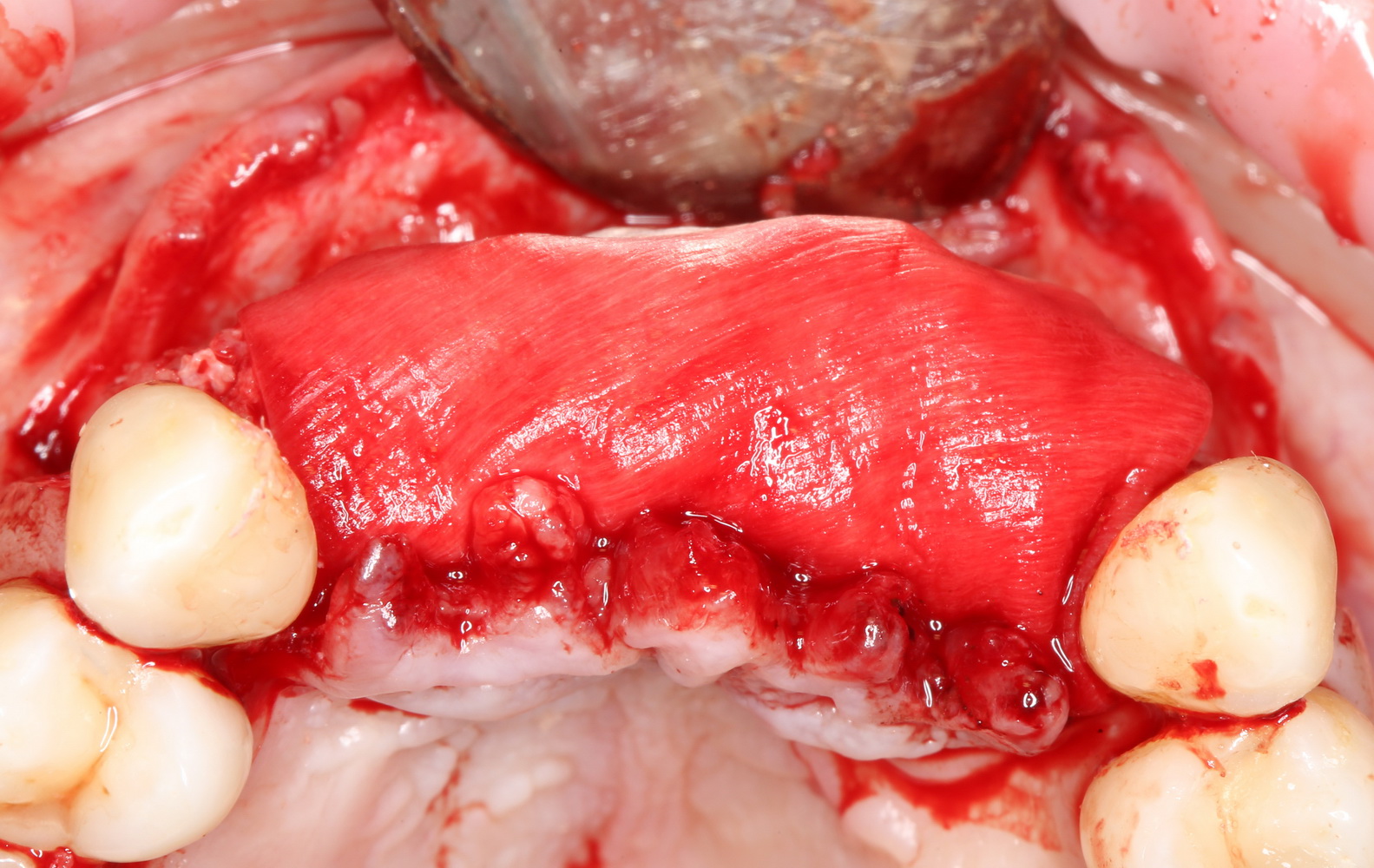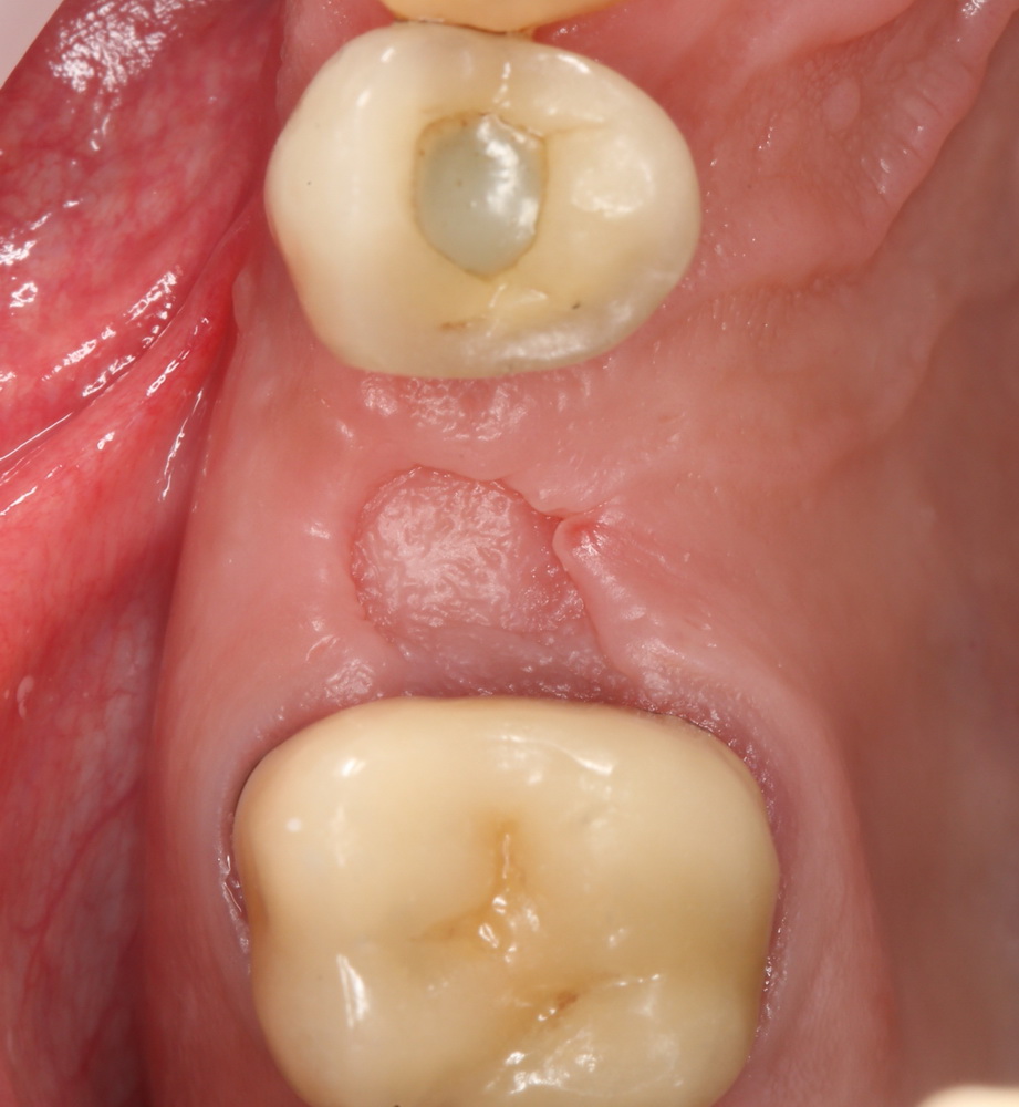 Итак, рассмотрим ситуацию. Мы удалили четыре зуба, установили два импланта, сделали остеопластику. Дефицит слизистой оболочки из-за наличия лунок удаленных зубов, усугубился после изменения объема альвеолярного гребня. Герметично зашить такую рану будет сложно, а риски расхождения швов высоки. Думаю, не стоит объяснять, чем это грозит в эстетически значимой зоне.