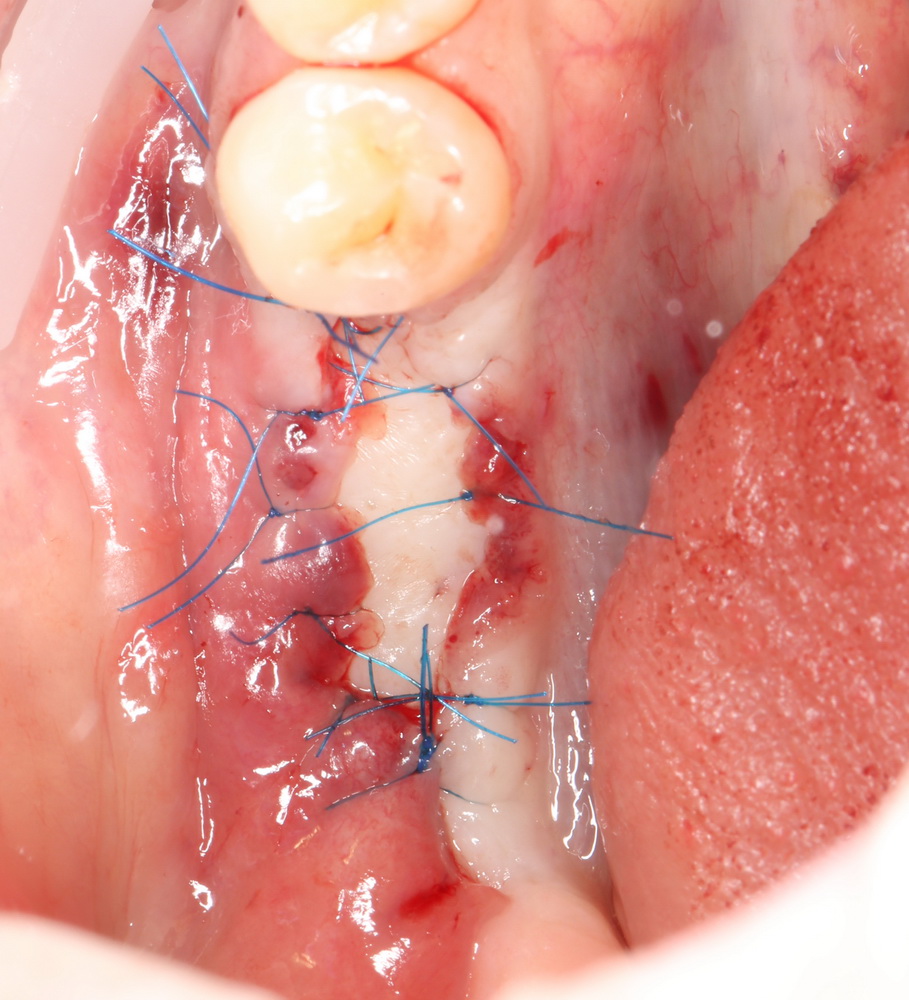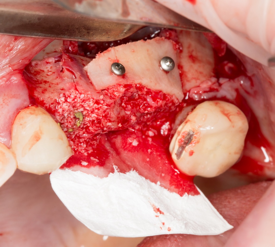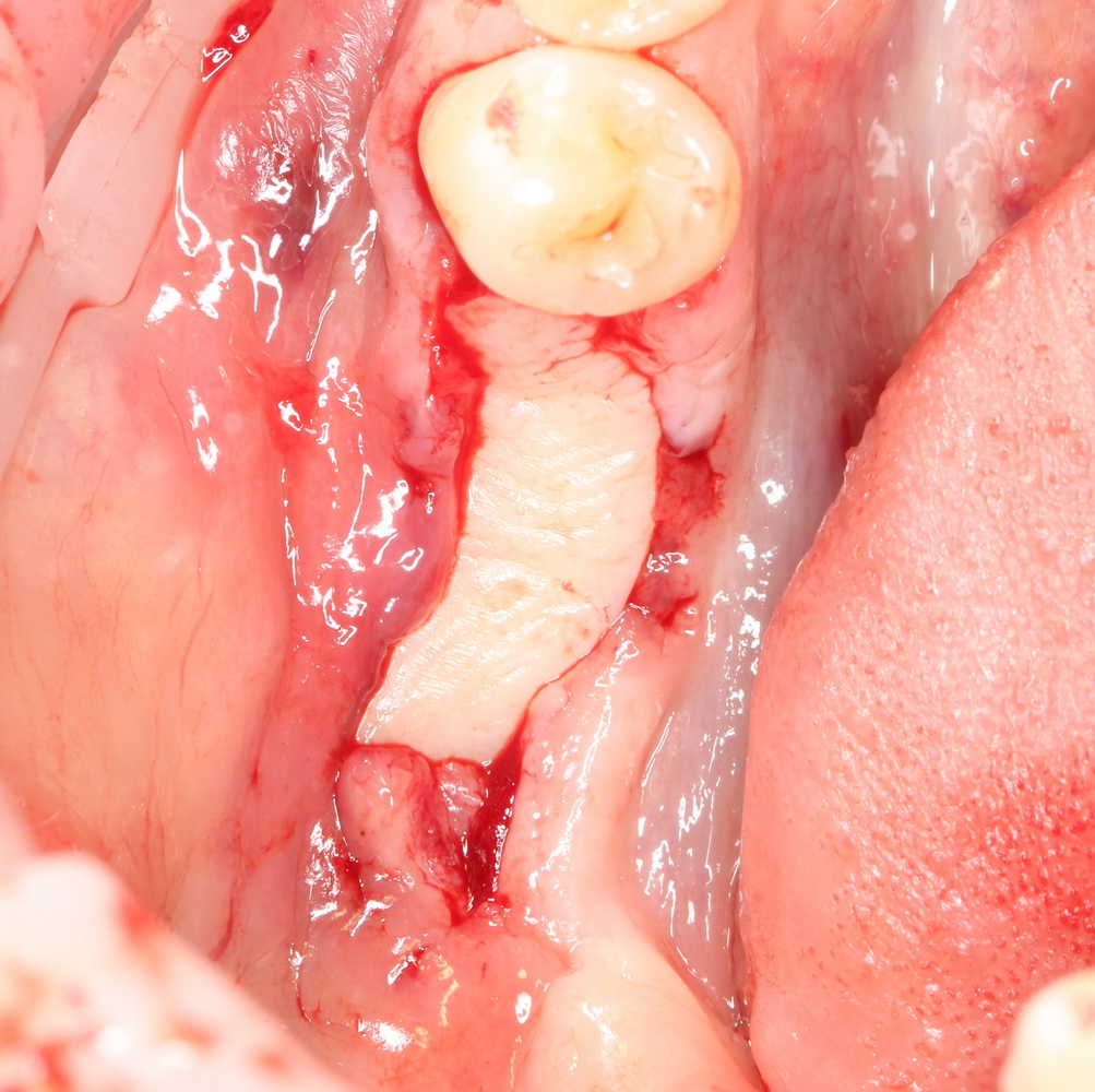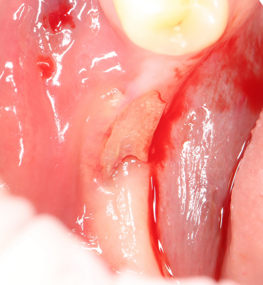 Приведу пример. После вертикальной остеопластики из-за дефицита слизистой оболочки над областью операции, у пациента открылась часть костного блока: