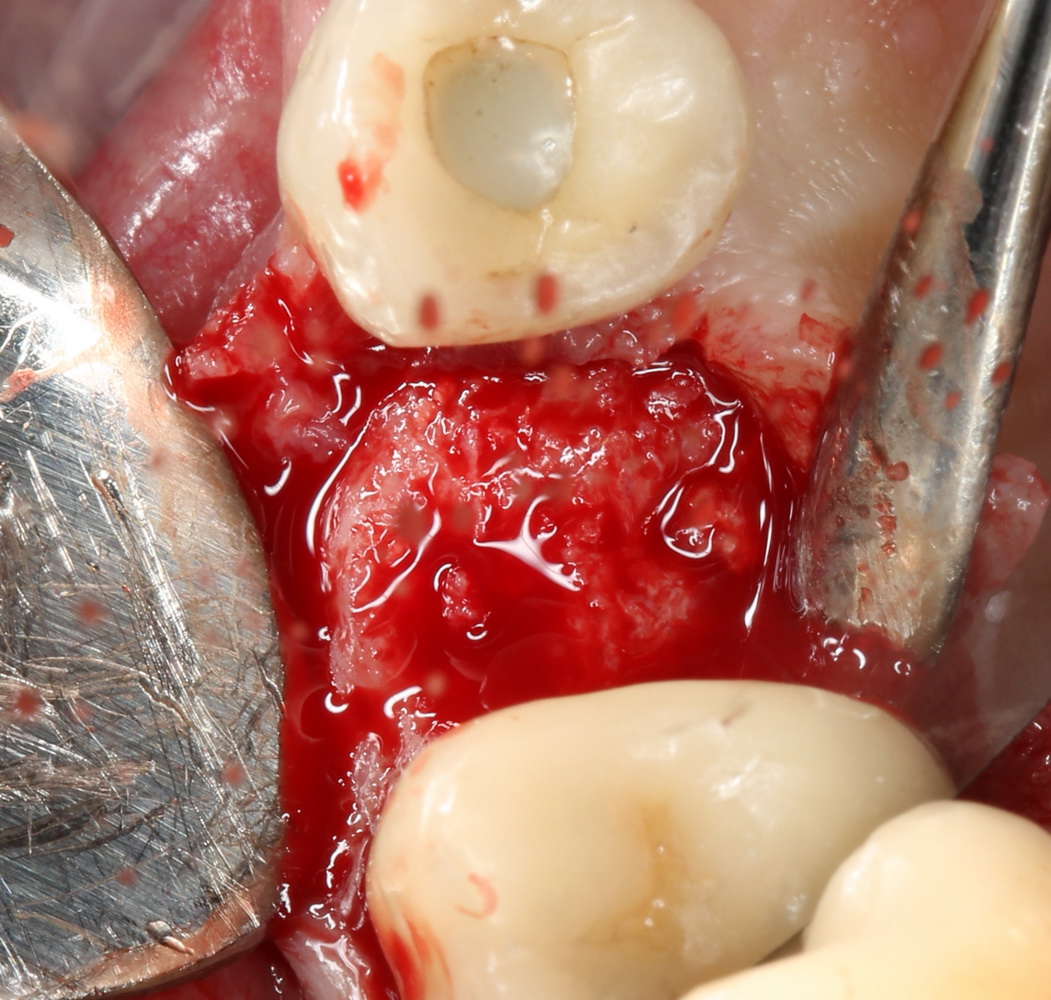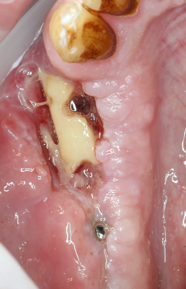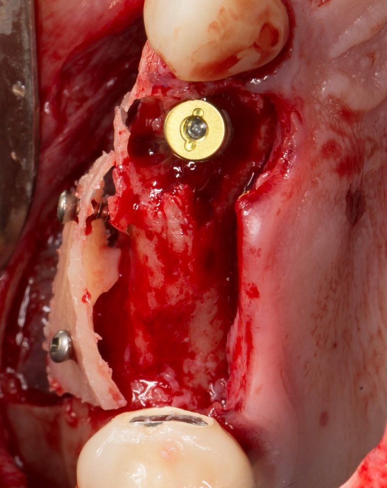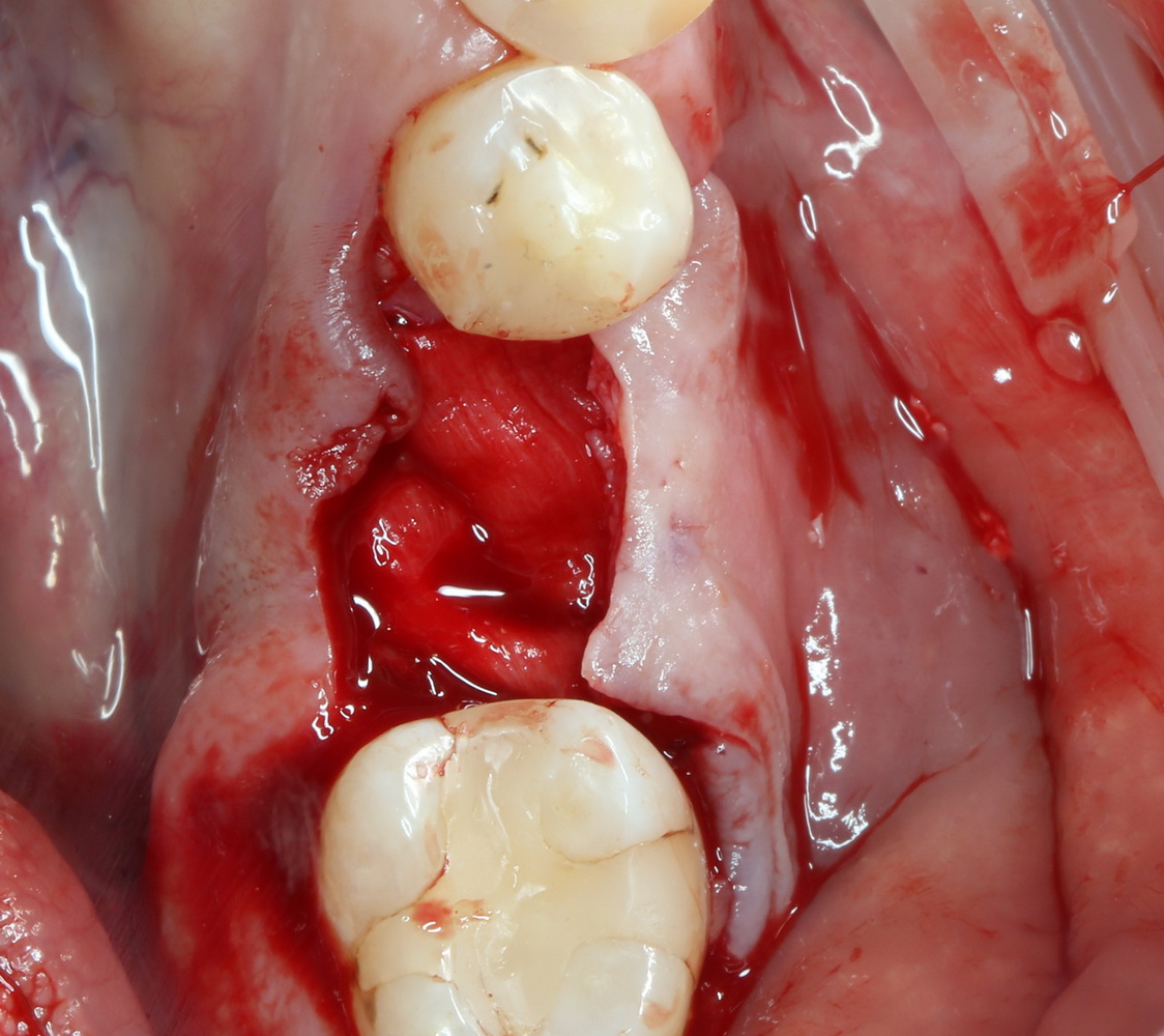 Приведу пример. После вертикальной остеопластики из-за дефицита слизистой оболочки над областью операции, у пациента открылась часть костного блока: