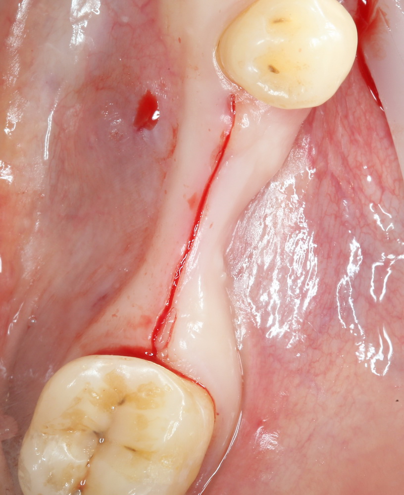 Рассечение надкостницы проводится под подвижной слизистой оболочкой. Это позволяет растянуть ее, увеличив размер лоскута примерно, на 50-70%. В идеале, после проведения этого этапа, рана должна легко закрыться сама, без швов и какого-либо натяжения: