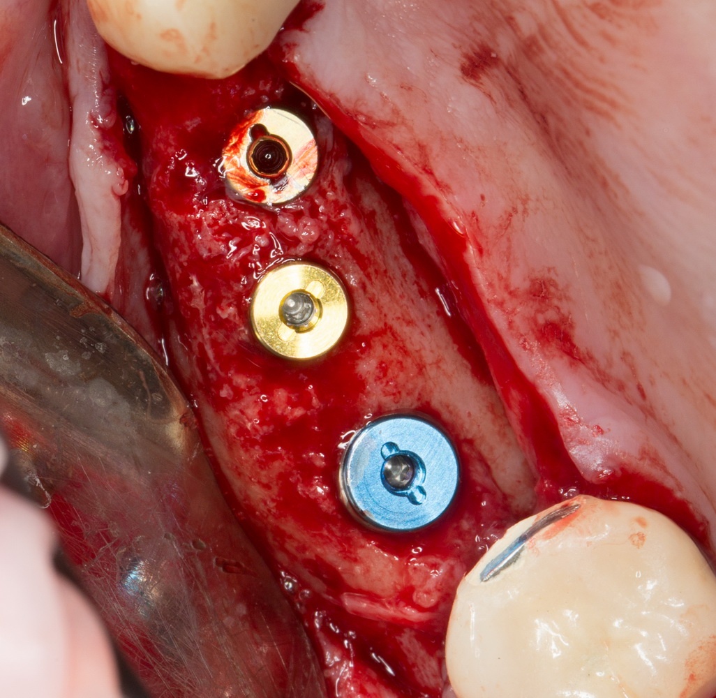 При сочетании остеопластики с немедленной имплантацией лучше отказаться от каких-либо супраструктур, поскольку они нарушают герметичность раны, и по ним микрофлора полости рта может инфицировать графт. Даже если очень не хочется, но импланты при этом нужно ушивать наглухо. Да, мы теряем какой-то объем прикрепленной десны, но зато существенно снижаем риски неудачи при остеопластике. Как в следующем примере: