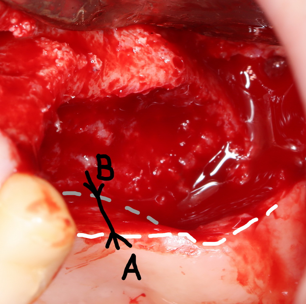 2. Угол разреза — таким образом, чтобы создать наибольшую его глубину. Разрез по кратчайшему пути, с одной стороны, облегчает доступ, не увеличивая площади операционной раны. С другой стороны, увеличение расстояния между точками А и В (на фото) позволяет добиться герметичности швов и избежать их расхождения даже при относительно тонкой слизистой оболочке. Образующаяся при этом «буферная зона» не даст инфекции проникнуть в рану даже в случае частичного расхождения ее краев.