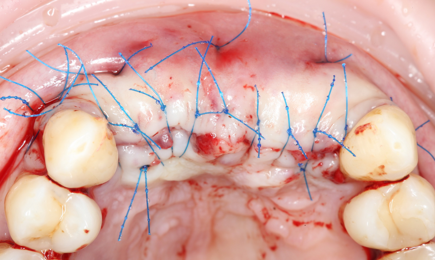Обратите внимание — все лигатуры, вколы/выколы иголки проходят в пределах кератинизированной десны. При излишнем натяжении подвижная слизистая оболочка просто рвется, а сами лигатуры прорезываются. И герметичности нашей ране это не добавляет.