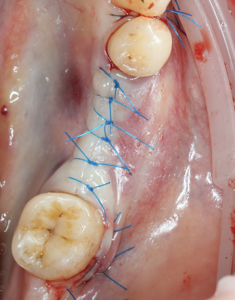 Идеальный вариант: монофиламентная нерезорбируемая нить размером от 4-0 до 6-0, в зависимости от биотипа слизистой, на атравматичной игле.