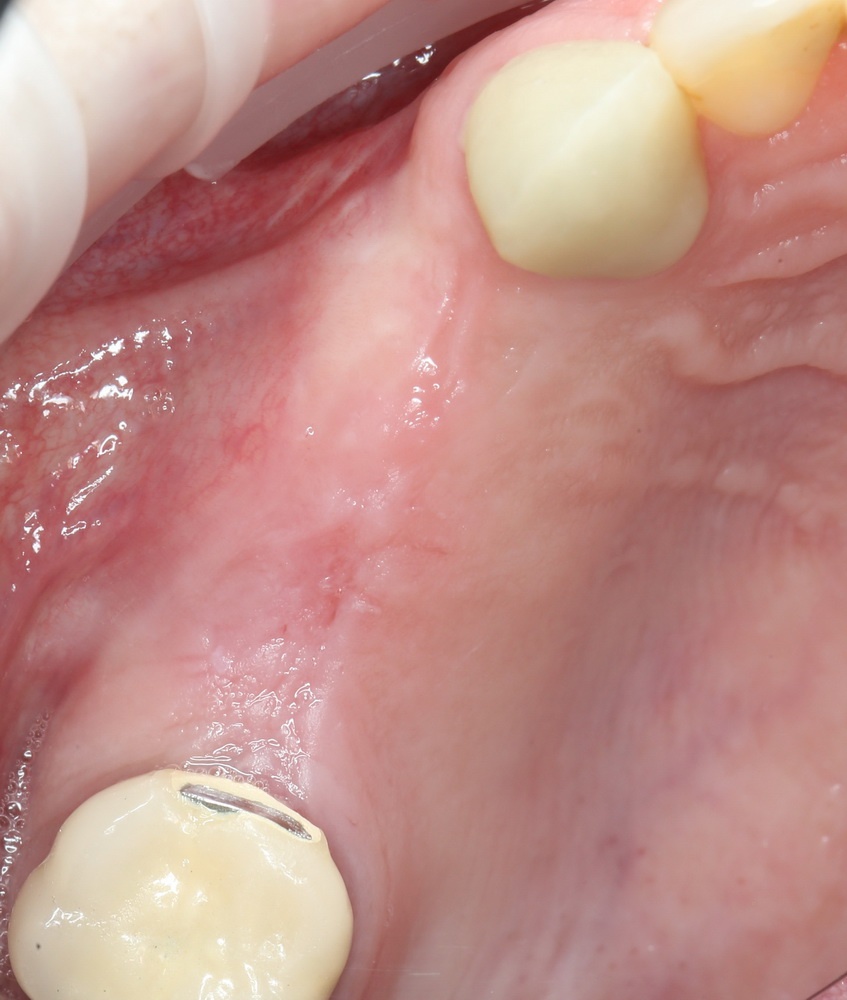 Попытки «утопить» его под слизистую оболочку успеха не имели, мы вынуждены убрать блок полностью. В итоге, мы не достигли нужного результата операции, ее придется повторить. И повторять ее в условиях существующего дефицита слизистой оболочки — это как дважды наступить на одни и те же грабли: вероятнее всего, мы опять пролетим. Поэтому новый этап лечения (точнее, перелечивания) мы начнем с пластики слизистой оболочки. Делается это очень просто — пересадкой кератинизированной десны с нёба: