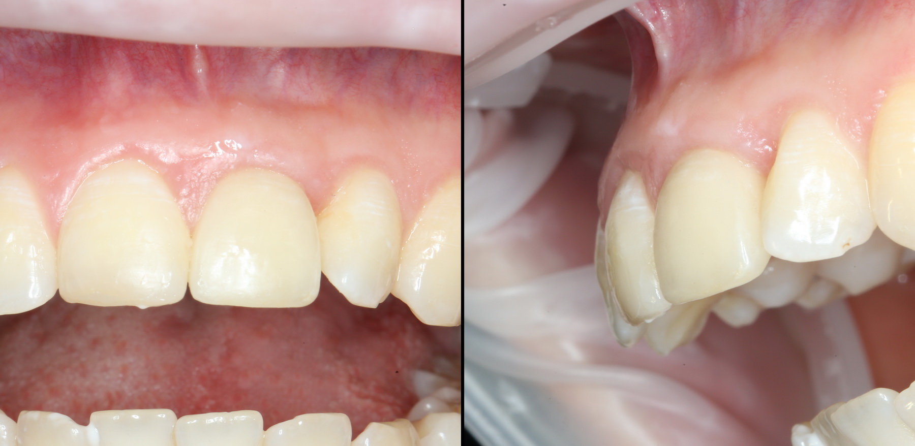 Снимок слева сделан сразу после операции, а справа — через 4 месяца, на этапе установки формирователей десны.