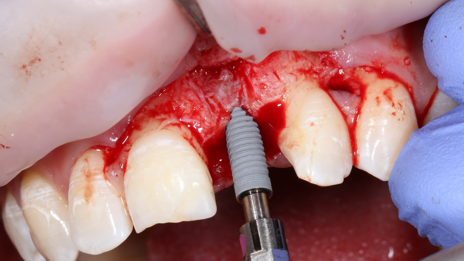Для начала, нужно определиться с методикой. В данном случае подойдет любой из методов, но совместно с пациенткой мы решили установить импланты и провести одномоментную остеопластику методом аутотрансплантации костного фрагмента. Поэтому стоит подумать о том, чтобы всю операцию провести через одну рану. Это уменьшит травматичность и облегчит уход за областью вмешательства в послеоперационном периоде.