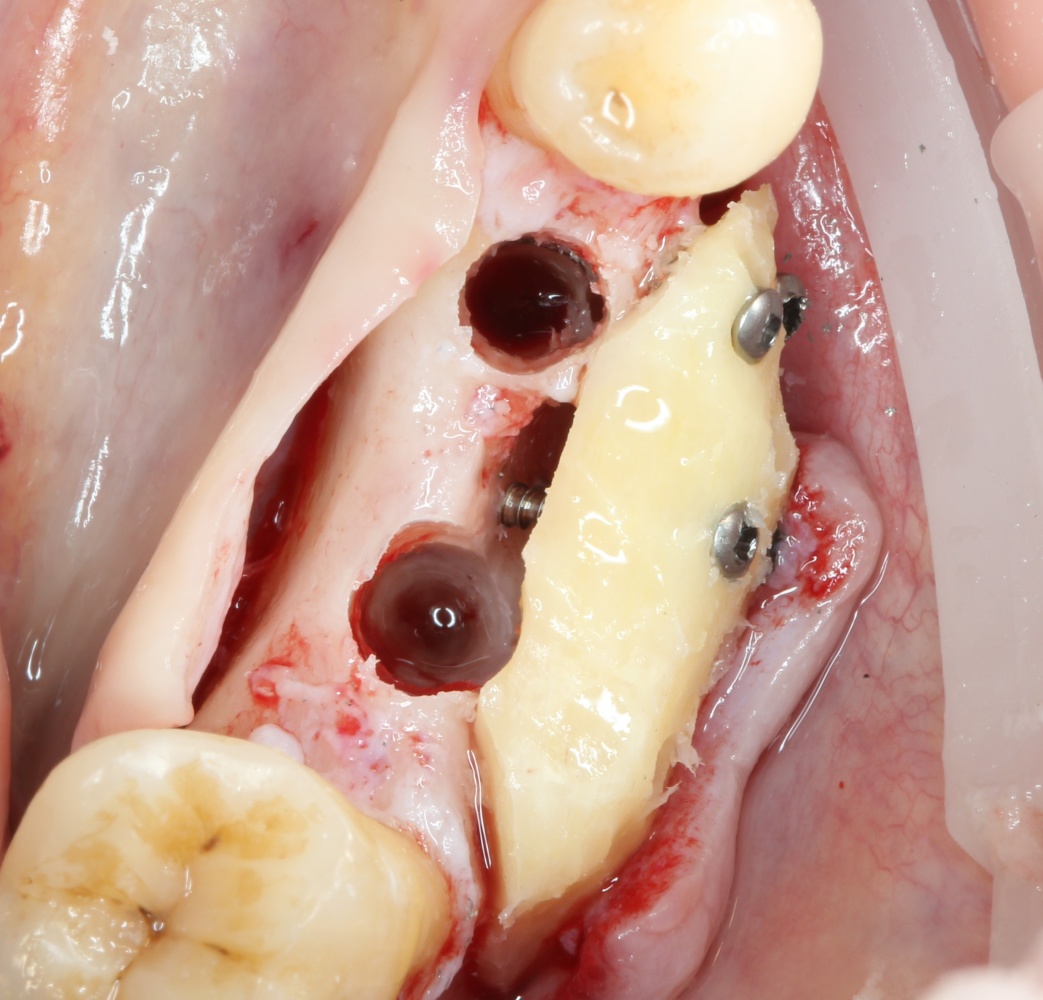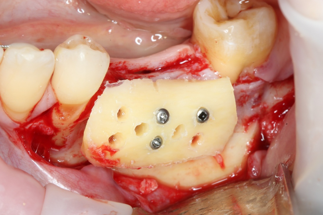 Многие ошибочно предполагают, что большое количество дырок в блоке нужно для того, чтобы «всё лучше срослось». На деле, большое количество отверстий в аутокостном фрагменте даст нам возможность переставлять вины и адаптировать его «на месте». А это особенно важно для одномоментной установки имплантов, потому что винты не должны попасть в проекцию будущей лунки.